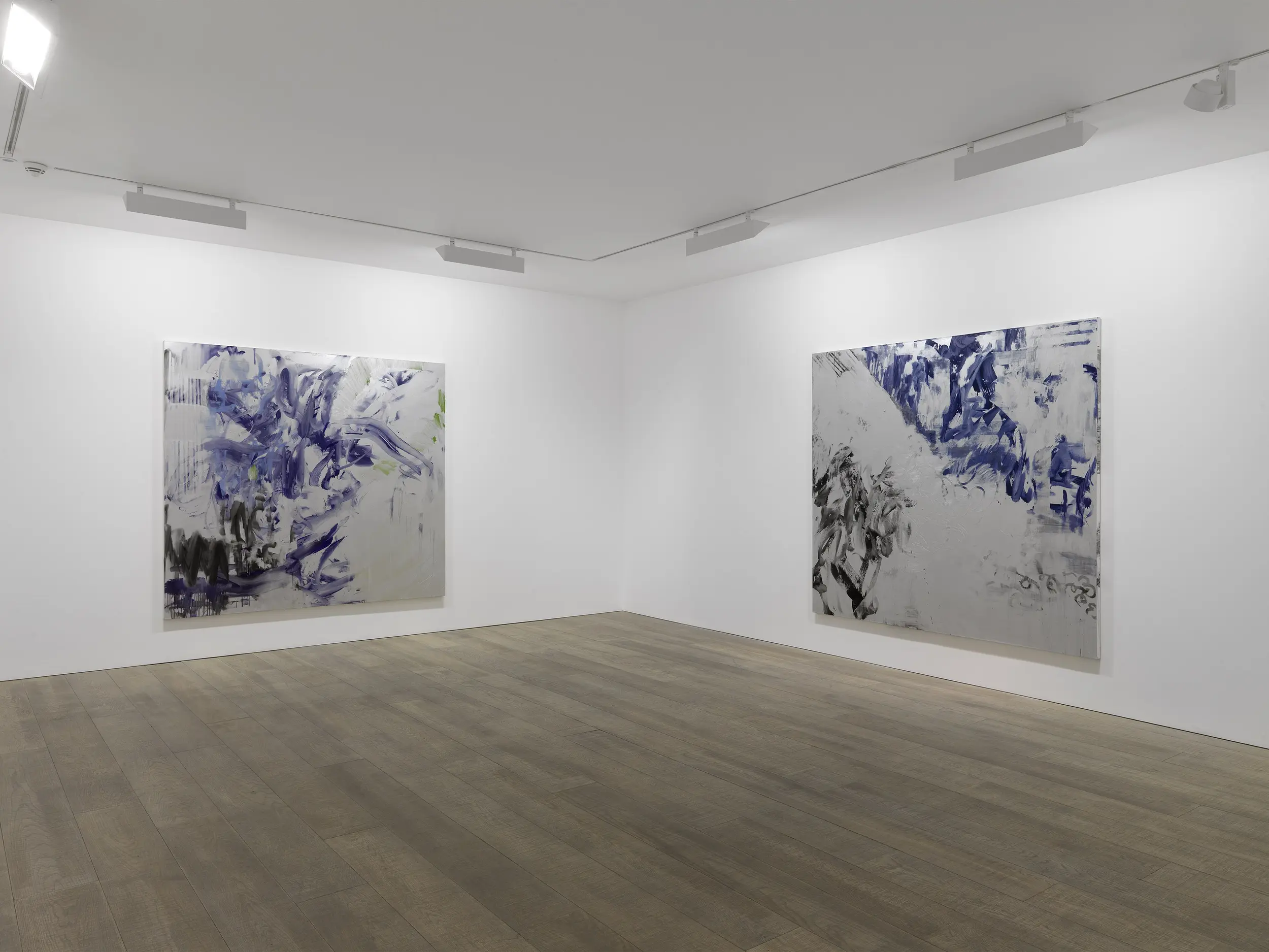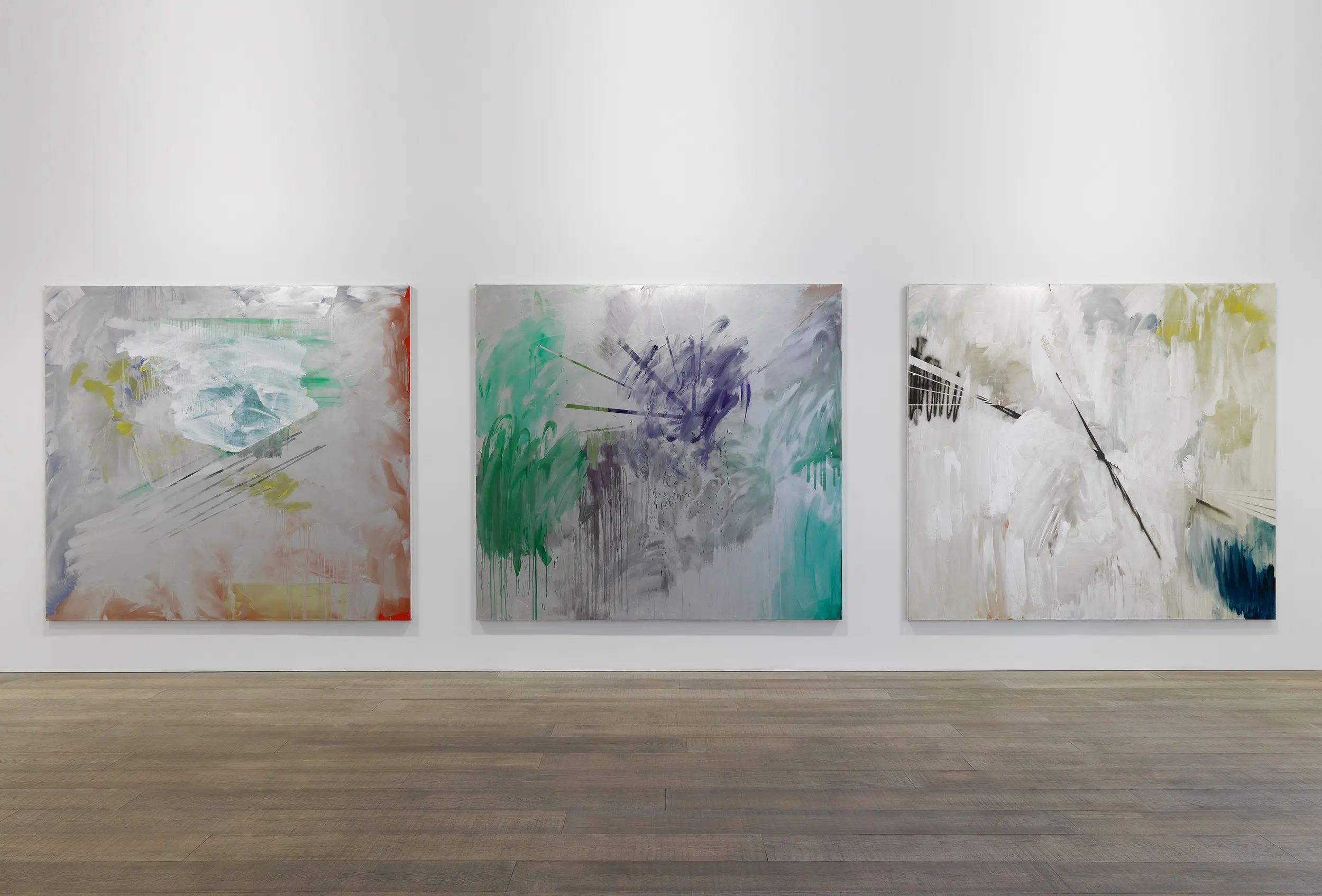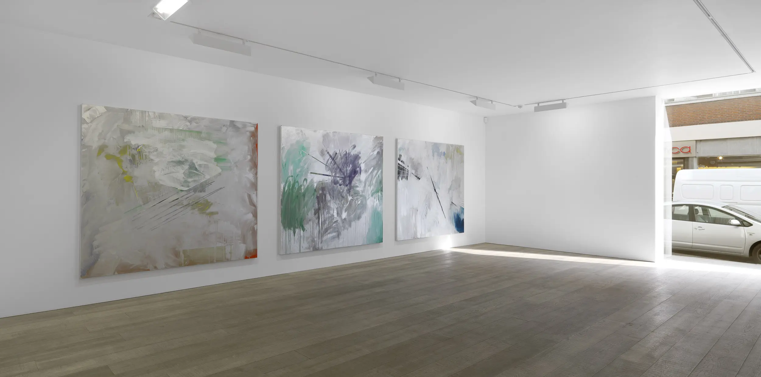 In this current series on view, the paintings open themselves up, offering expansive fields in which Humphries knits antagonistic techniques into singular surfaces. "The paintings seem to switch on and off", Humphries has stated. Light reacts to the swathing metallic silver surfaces of her paintings and reflects back at the viewer, moving across the surface and constantly shifting the balance of light and dark – subtly always altering the appearance, and presenting the conditions for an arresting, yet unstable visual encounter that physically engages human presence.