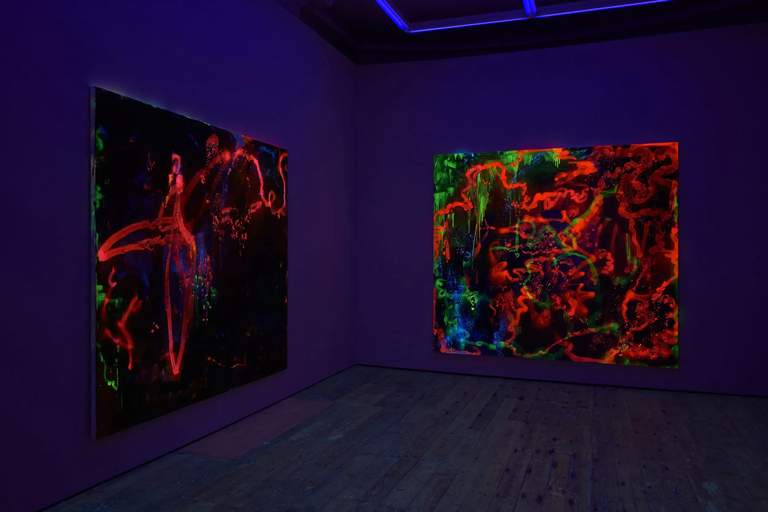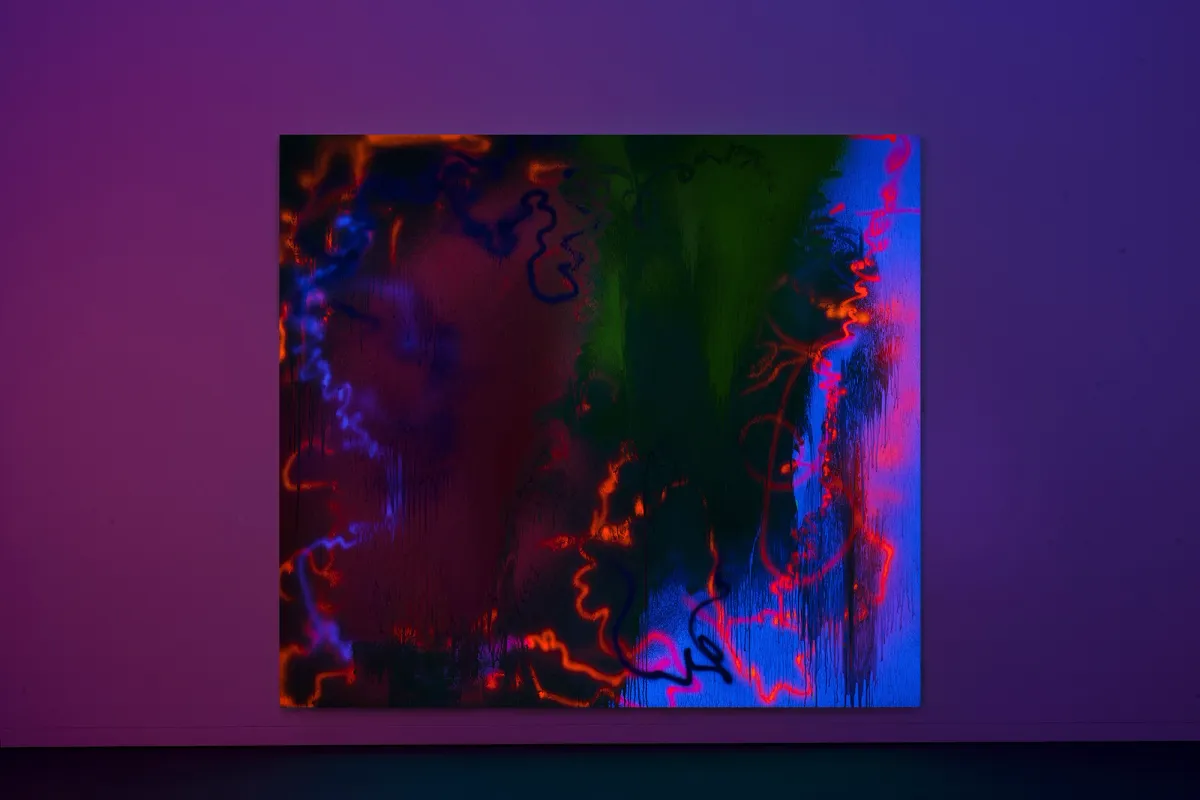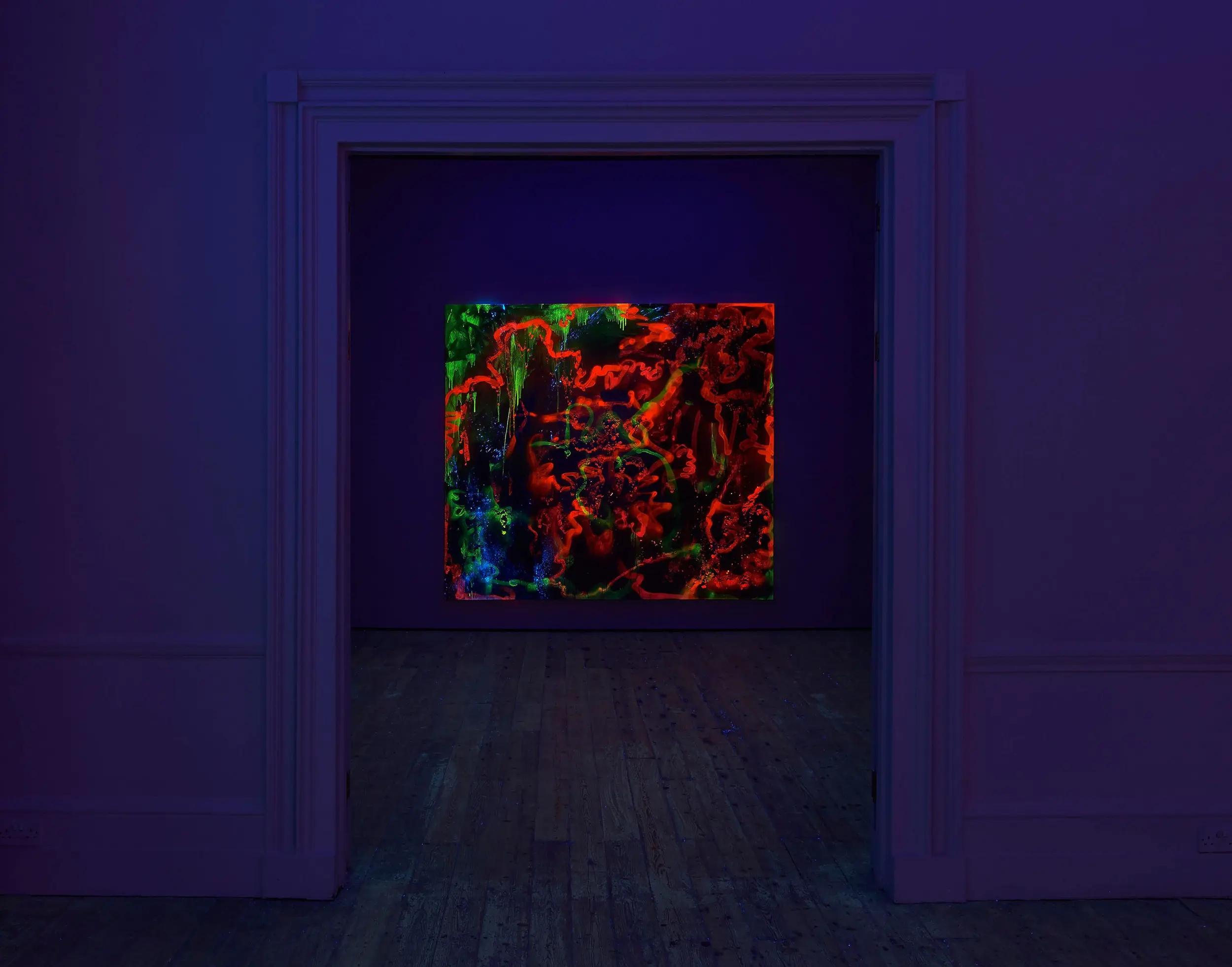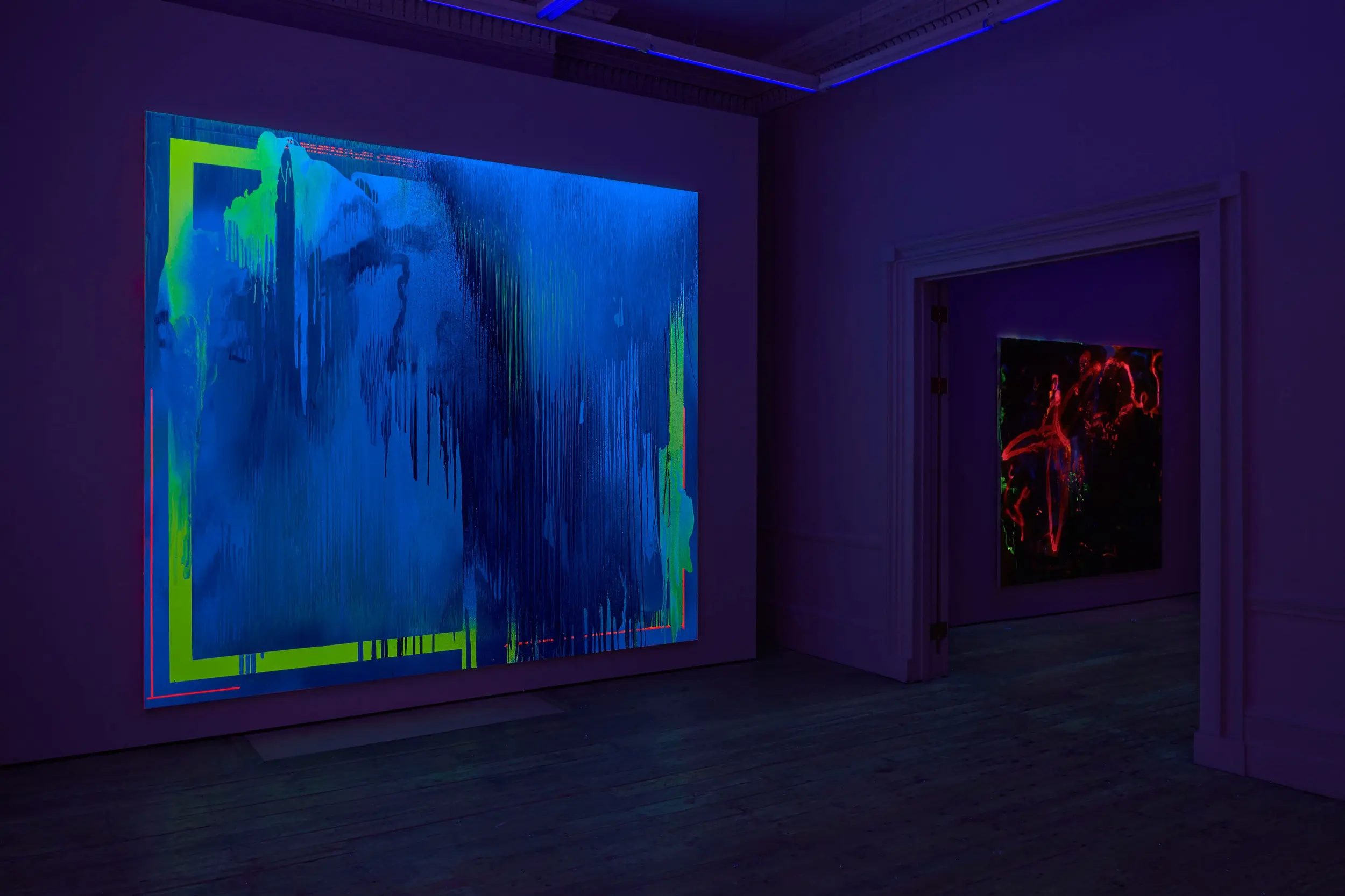 Stuart Shave/Modern Art is pleased to announce a solo exhibition of new paintings by Jacqueline Humphries. This is the American painter's third solo show with Modern Art. Jacqueline Humphries' exhibition is comprised of two distinct bodies of work presented in two locations. At Modern Art's Helmet Row gallery, Humphries presents a new body of large abstract paintings. At Modern Art's Fitzroy Square gallery, Humphries exhibits a new body of 'black light' paintings illuminated only by ultraviolet light. These 'opposite' shows, conceived and painted at the same time, are two different halves of Humphries' exhibition. Since the 1980s, Jacqueline Humphries has unrelentingly pursued the practice and critical conversation of abstract painting. She has recently spoken about making paintings as 'unfinishing' or 'unmaking' them - which is to describe a process of continually breaking into the known or recognisable structure of an abstract painting, and of disintegrating and complicating the spatial and compositional characteristics of figure/ground relationships. Humphries' use of reflective silver and fluorescent paints in differing bodies of work builds an 'optically unstable' character into the surfaces of her paintings as they variously absorb, reflect, and react to light under the conditions of their viewing and in relation to the primary physical experience of the viewer. Jacqueline Humphries lives and works in New York, USA. Humphries' paintings were recently included in the 2014 Whitney Biennial, New York, USA, and have been shown in exhibitions at American museums including MOCA Cleveland (2012), Hessel Museum of Art, Bard College, Annandale-on Hudson, NY (2010, 2007); and the Institute of Contemporary Art, Philadelphia, PA (2001). Humphries' paintings are held by museum collections including the Whitney Museum of American Art, The Museum of Modern Art, New York, and the Smithsonian Institution, Washington DC. Coincident with Humphries' exhibition at Modern Art is the publication of a new monograph by Koenig Books surveying Jacqueline Humphries' work, collecting together a decade of paintings with essays by David Joselit, Suzanne Hudson and Angus Cook.