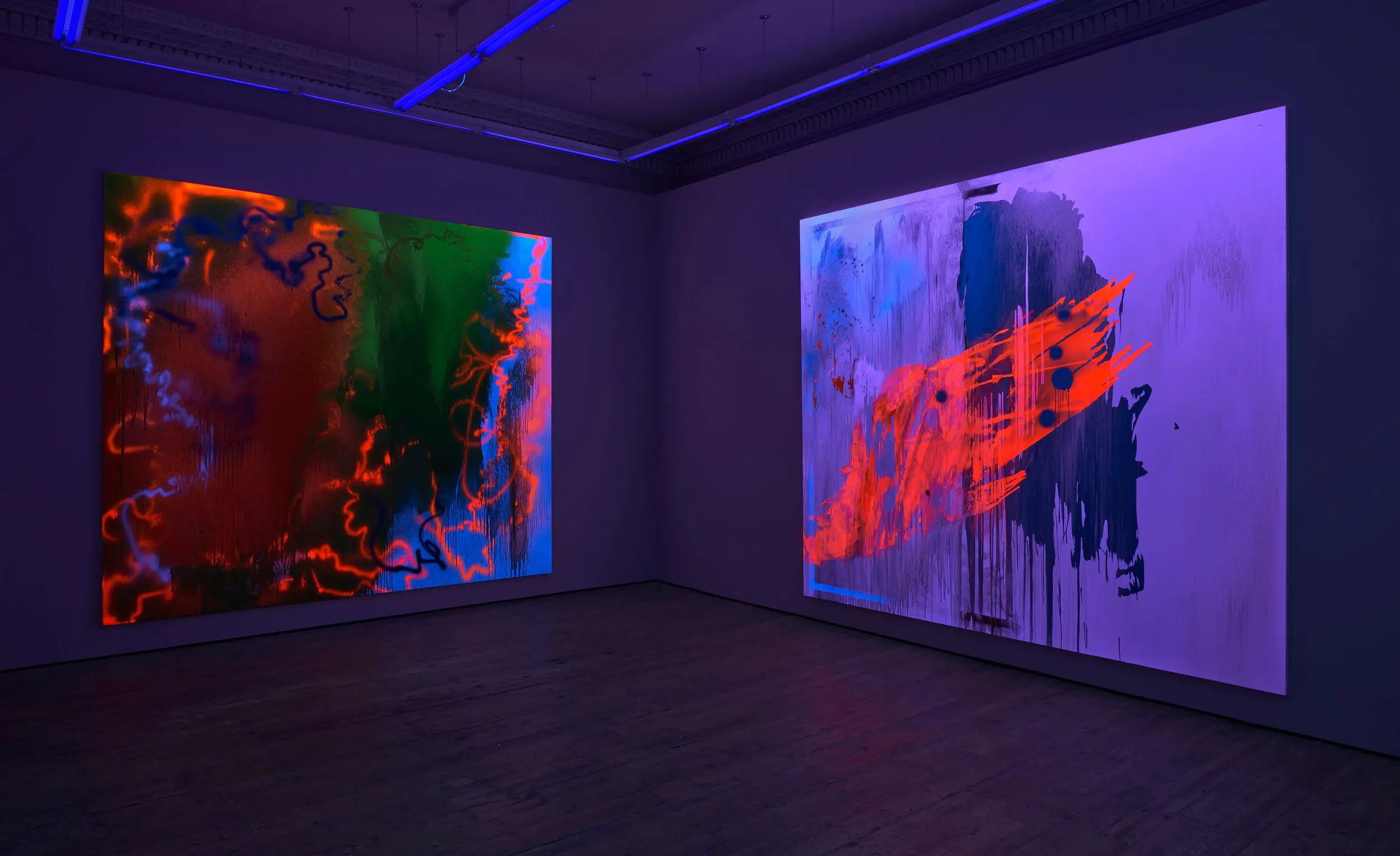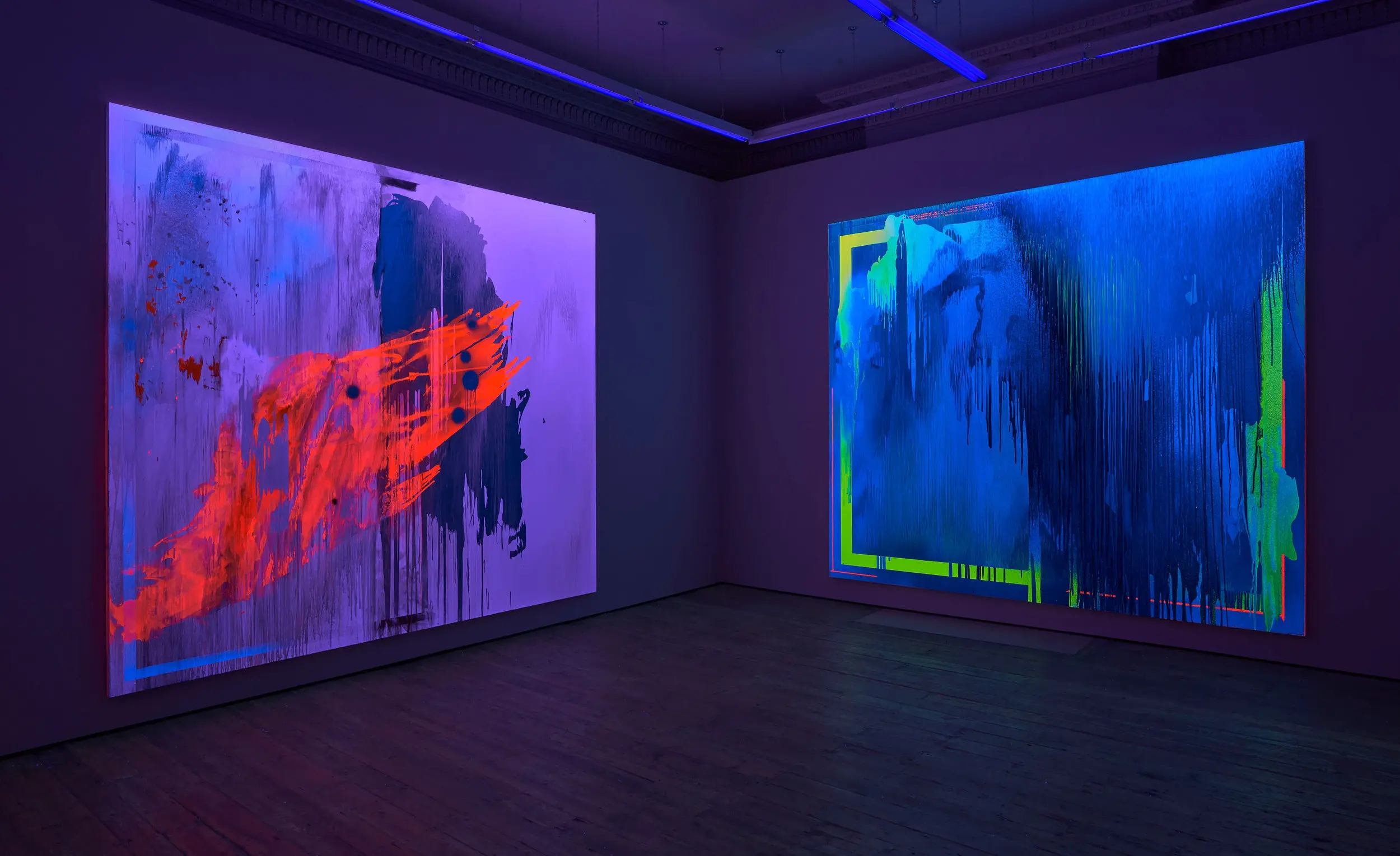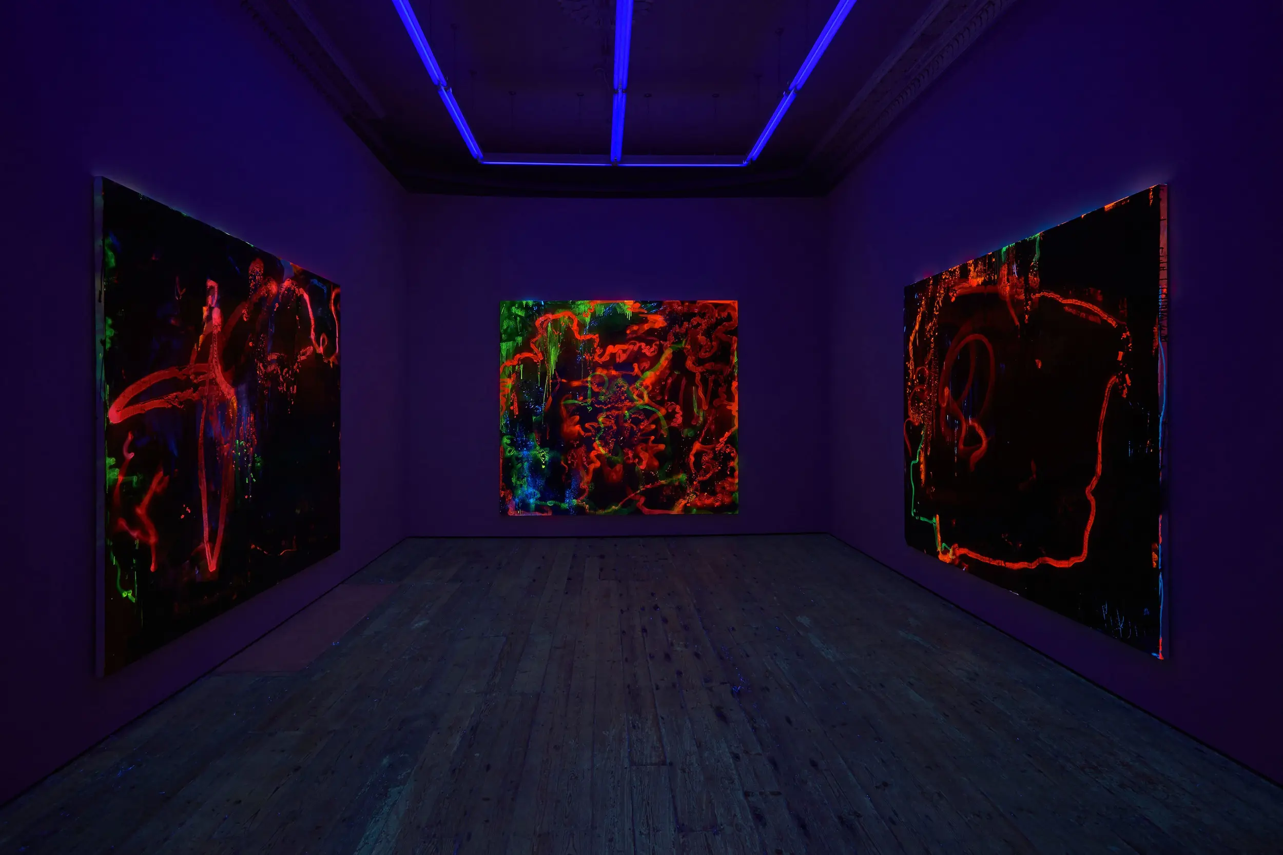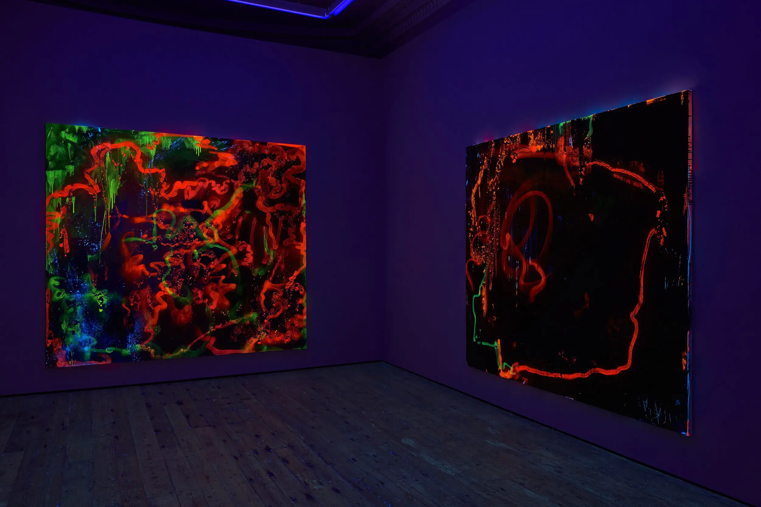 Stuart Shave/Modern Art is pleased to announce a solo exhibition of new paintings by Jacqueline Humphries. This is the American painter's third solo show with Modern Art. Jacqueline Humphries' exhibition is comprised of two distinct bodies of work presented in two locations. At Modern Art's Helmet Row gallery, Humphries presents a new body of large abstract paintings. At Modern Art's Fitzroy Square gallery, Humphries exhibits a new body of 'black light' paintings illuminated only by ultraviolet light. These 'opposite' shows, conceived and painted at the same time, are two different halves of Humphries' exhibition. Since the 1980s, Jacqueline Humphries has unrelentingly pursued the practice and critical conversation of abstract painting. She has recently spoken about making paintings as 'unfinishing' or 'unmaking' them - which is to describe a process of continually breaking into the known or recognisable structure of an abstract painting, and of disintegrating and complicating the spatial and compositional characteristics of figure/ground relationships. Humphries' use of reflective silver and fluorescent paints in differing bodies of work builds an 'optically unstable' character into the surfaces of her paintings as they variously absorb, reflect, and react to light under the conditions of their viewing and in relation to the primary physical experience of the viewer. Jacqueline Humphries lives and works in New York, USA. Humphries' paintings were recently included in the 2014 Whitney Biennial, New York, USA, and have been shown in exhibitions at American museums including MOCA Cleveland (2012), Hessel Museum of Art, Bard College, Annandale-on Hudson, NY (2010, 2007); and the Institute of Contemporary Art, Philadelphia, PA (2001). Humphries' paintings are held by museum collections including the Whitney Museum of American Art, The Museum of Modern Art, New York, and the Smithsonian Institution, Washington DC. Coincident with Humphries' exhibition at Modern Art is the publication of a new monograph by Koenig Books surveying Jacqueline Humphries' work, collecting together a decade of paintings with essays by David Joselit, Suzanne Hudson and Angus Cook.