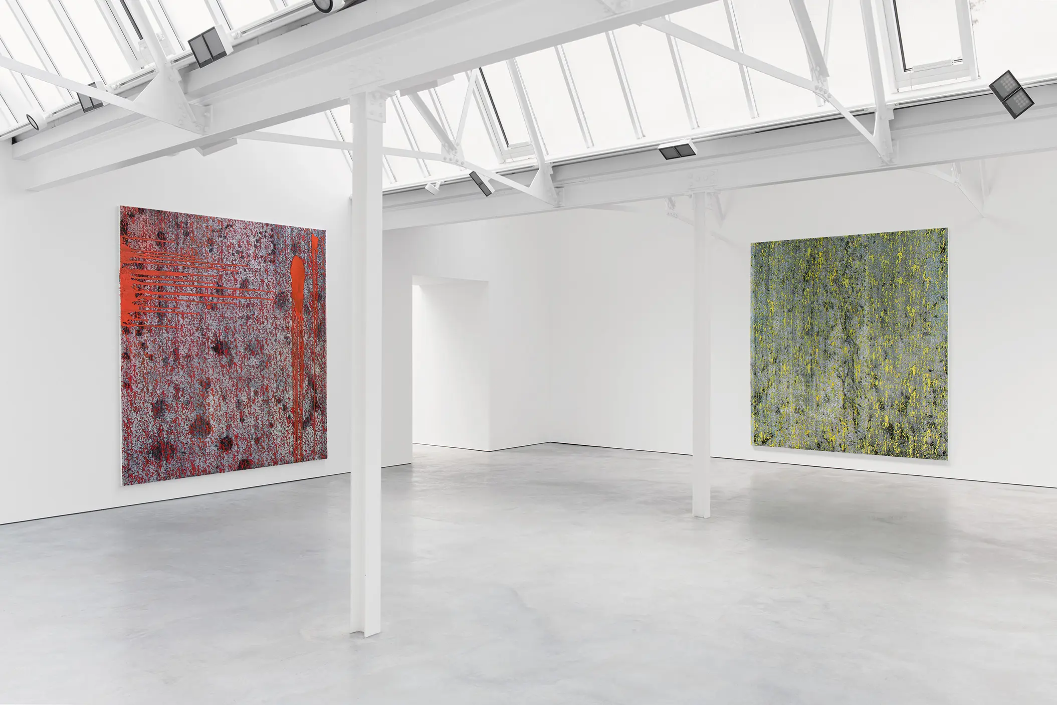 Shown across both galleries, Humphries’ new body of work for Modern Art takes the form of individual or multi-panel arrangements of large-scale canvases. In it, she continues to wrestle in the conflict between erasing trace of the hand and reinstating it through mechanical means; a binary that is echoed elsewhere in her practice where precision meets accident and consideration counters intuition. The legacies of Abstract Expressionism are folded into her process, with paint applied in gestural homages to Jackson Pollock, Barnett Newman and Lucio Fontana. But the granular surface of Humphries’ own iconic vernacular carries through the span of her recent work; her marked, gridded surfaces incorporating such quotidian signs as digital static and emojis: the visual fabric of our online existences.