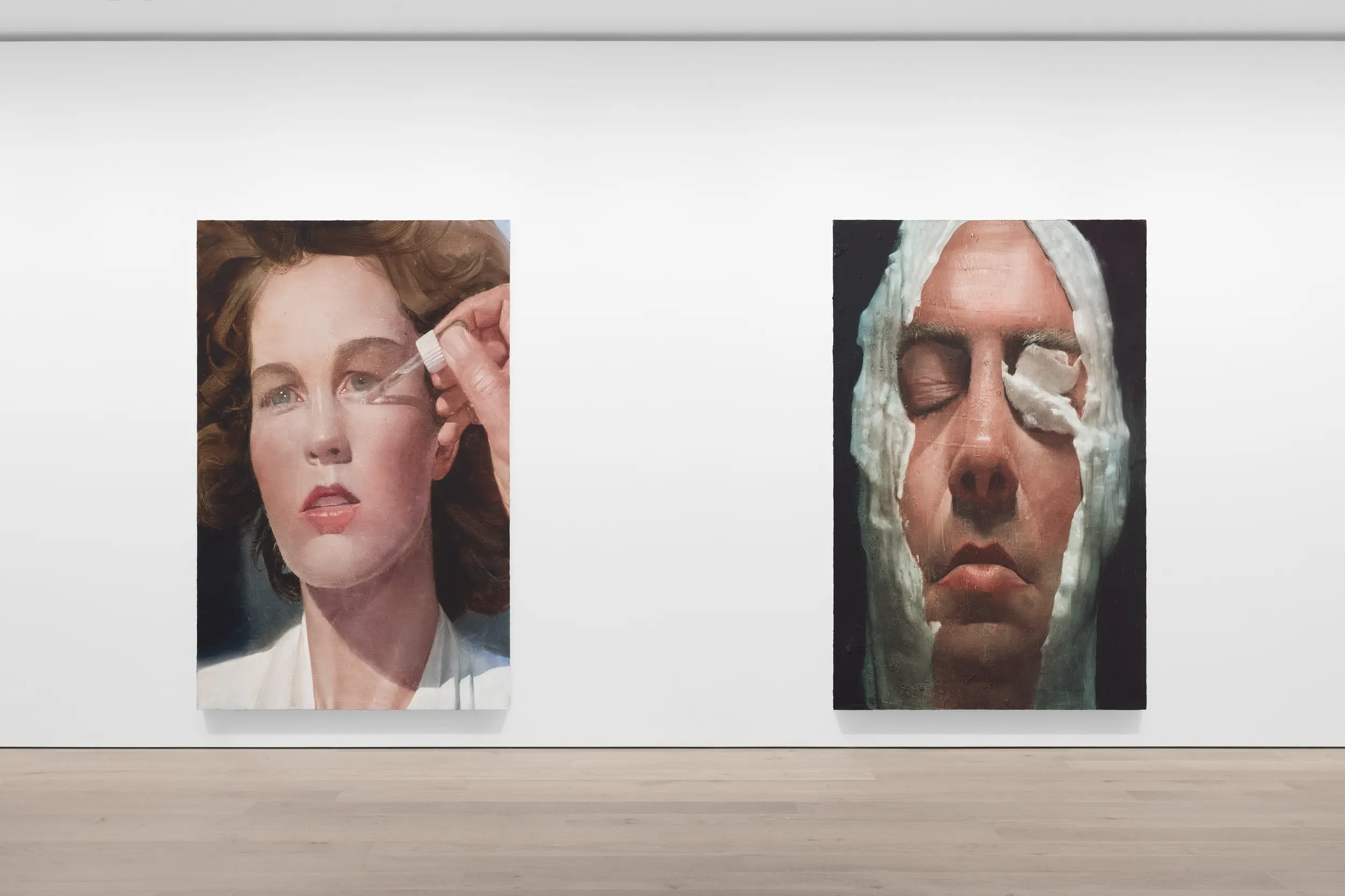 Polygrapher denotes both the exhibition title and a text written by the artist, published in the exhibition’s accompanying booklet. Taking the form of an interrogation the artist underwent attached to a Stoelting UltraScribe––and in which only the answers have been transcribed––it creates a framework for the experience of the subsequent paintings. Masks, paint, screens, taped-over goggles, debris, foam, the paintings' obscured subjects echo the alleged verity laid out within the text.