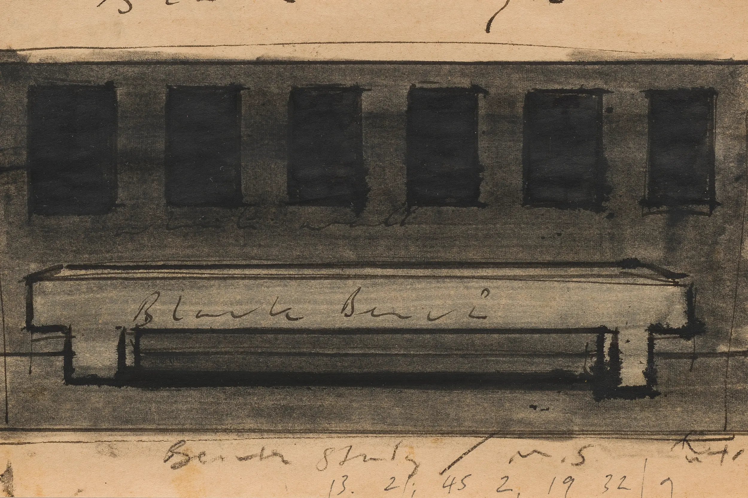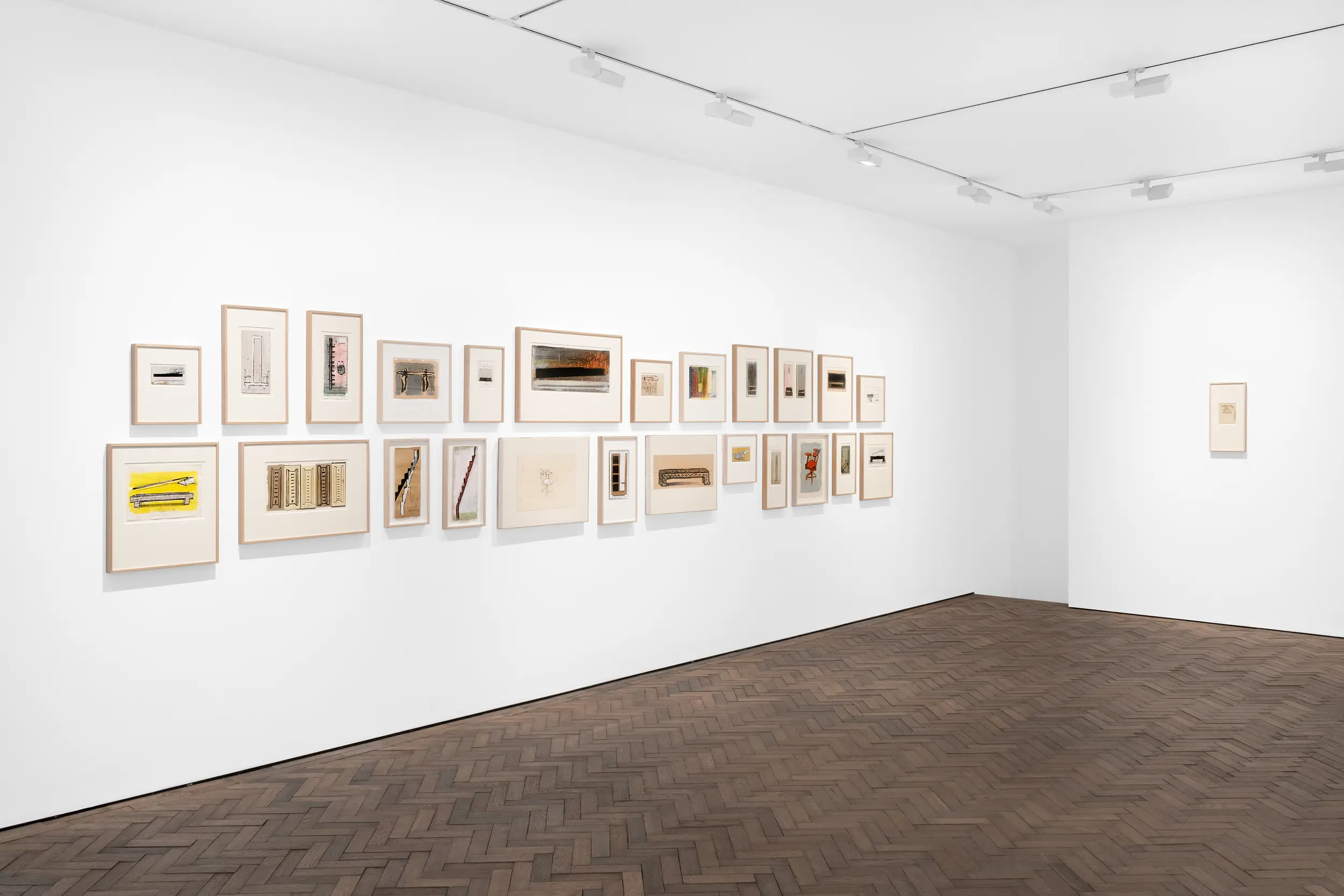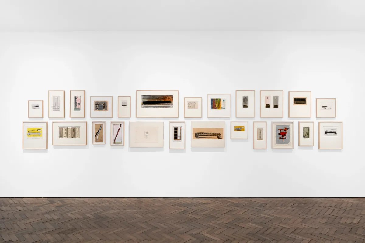 Modern Art a le plaisir de présenter Drawing towards Paintings: Selected Drawings 1974-2024, la deuxième exposition personnelle de Michael Simpson avec la galerie. S’il est surtout connu pour ses peintures, cette exposition dévoile une pratique plus étendue. Le dessin, chez Simpson, n’est pas accessoire : il ponctue ses journées, chaque soir, dans un geste régulier et nécessaire. Utilisant des matériaux tels que le crayon charbon, la craie de tailleur, l'encre de Chine, la gouache et la peinture à l'huile, il dessine sur des surfaces à portée de main, des serviettes de restaurant, des cartons usagés, des pages de garde aux couvertures de livres. Ces choix révèlent l’élan spontané qui sous-tend son processus artistique. Chacune de ses œuvres diffère sensiblement, allant d'exemples rendus avec économie et rapidité à des dessins plus graphiques, proches de plans d'architecture. À l'instar de ses peintures, ses dessins représentent une sélection restreinte de formes répétées, notamment des confessionnaux, des bancs, des échelles et des louches de lépreux.