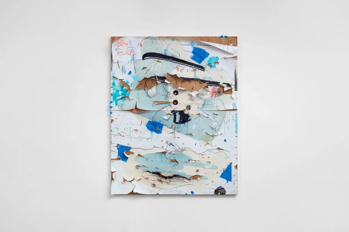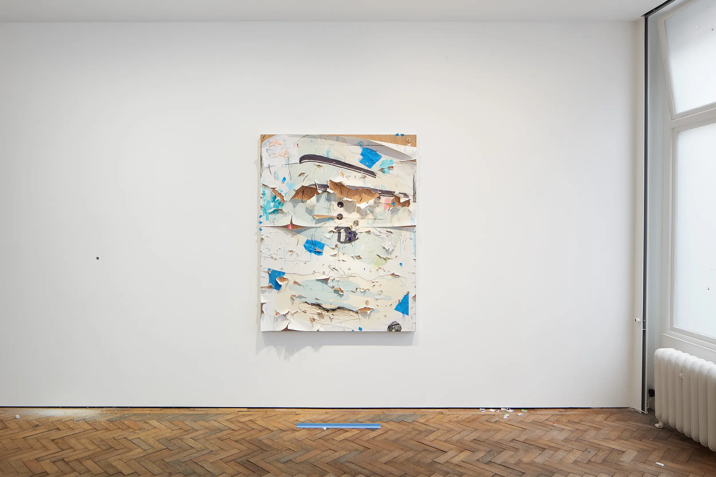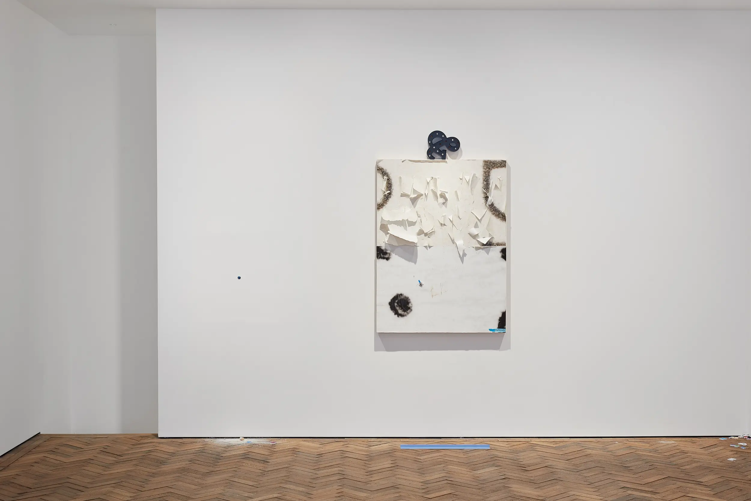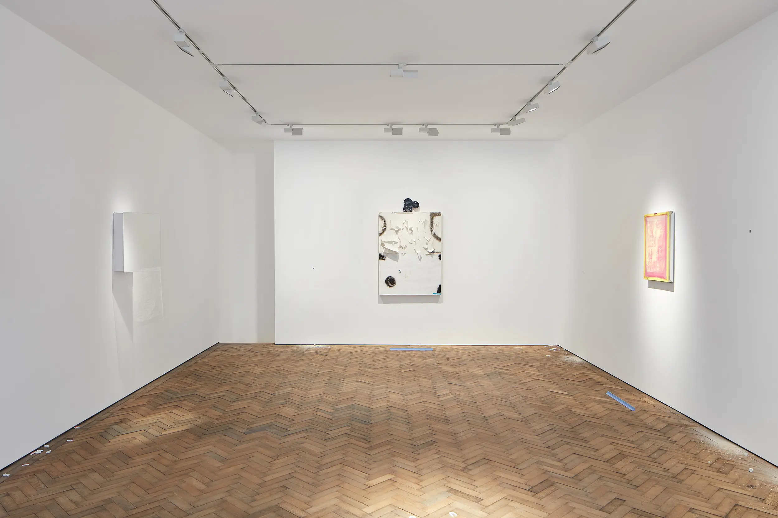 Pope.L’s exhibition with Modern Art centres on his ongoing project, Skin Set, a constantly growing and shifting group of text-inflected works across many media that consider the construction of language, identity and stereotype as notation, hole and frequently absurdity and humour. The show, installed on both floors of the gallery, contains video, silkscreen, assemblage, floor pieces and paintings made between 2015 and 2021. On view are several medicine cabinets originally shown at the University of Chicago’s Neubauer Collegium earlier this year. Each cabinet contains a plexiglass-encased painting illuminated by LED light. The incongruity of the cabinets, their altar-like aspect and the frame-within-a-frame-within-a-frame mode create a curious preciousness that is called into question by the text inscribed on the paintings, such as ‘Violet People Are Plusher.’ The medicine cabinet works share the walls with assemblages on panel, whose paper surfaces are scraped, inscribed, sliced, decorated and punctured creating the experience of painting as a page-space that is simultaneously coming together and coming apart. Despite medicine cabinet ‘caves’, punctured surfaces, altar-light, bits of letters pushed to the margins of the canvas, the usage of text is insistently present in these works. Circa (2015) is a group of twenty-four oil on linen paintings, each containing the word ‘fuchsia,’ which is usually misspelled, painted in bright pink and paired with another word with which it rhymes, such as: abracadabra, diarrhea, or bwana, among others. Here, legibility is undercut by scratches, crumples, gouges and smudges staging a space of writing not just as an act of communication but also one of visual glossolalia, a space somewhere between physical colour, the actual colour of a word, the word itself, the word used to describe the word and something different altogether. Visitors might notice that one of the 24 paintings has yet to be hung on its cleat. The eminent painting will change throughout the run of the show at the behest of the artist.