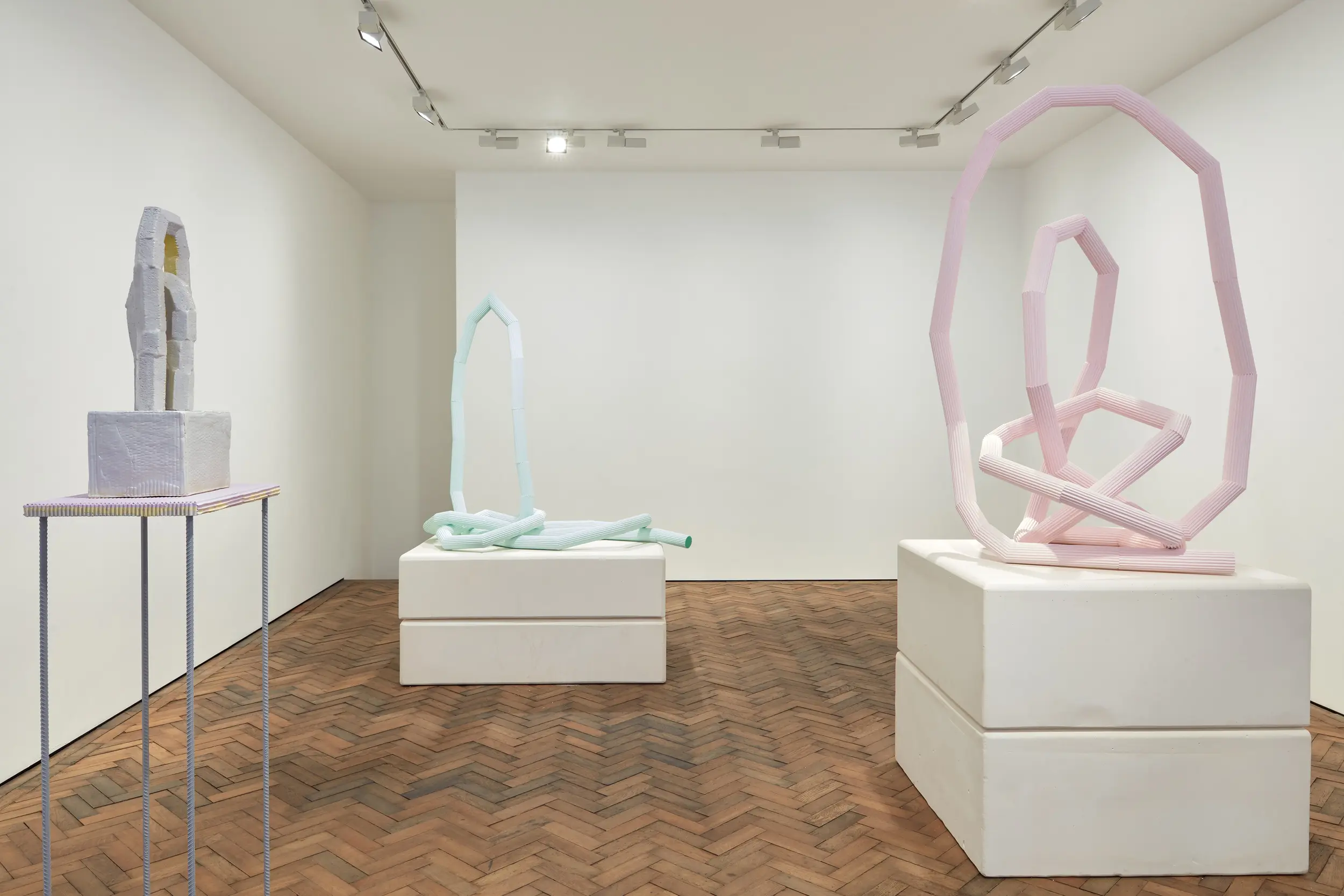 Modern Art is pleased to announce a solo exhibition of new work by Eva Rothschild at its Bury Street gallery. This is Rothschild’s sixth solo exhibition with Modern Art. Eva Rothschild’s sculptures are underpinned both by the legacy of modernist sculpture – notably the work of Hepworth, Brancusi, and Hesse - and the enduring forms of classical architecture. Typically using materials such as Jesmonite, Perspex, steel, polystyrene and ceramic, Rothschild’s work attends to relationships between objects and bodies, and to creating conversation between individual sculptures. Often grouped together in order to highlight dynamics between form, colour, and mass, Rothschild creates social spaces, both indoor and outdoor. How objects and materials acquire religious, spiritual and magical meanings is a question that her work continues to explore through its particular sculptural language that is always located somewhere between geometric and organic, and abstraction and figuration. The title of Rothschild’s exhibition for Modern Art conveys the idea of solace, reflecting the pull of her focus inwards over the past two years, following her large-scale installation at the Venice Biennale in 2019. The central three new sculptures of Rothschild’s show, Sphinx, Madonna and Empath, respectively, are cast in Jesmonite, which belies their unexpectedly soft, pensive nature. Installed on Bury Street’s ground floor, they have been created with the domesticity of the space in mind, which they delineate with an indeterminate, shimmering quality, in contrast to her signature hard-edge black forms that sharply determine the space around them. Human-scale and painted in pale green, purple, peach, and pink, they carry a fresh vulnerability, inviting a closer, more direct encounter with the body than their predecessors might have. Consistent with Rothschild’s work more generally, her new sculptures are episodic forms, which is to say it is as though they could be broken down into smaller components or extended infinitely – a notion referenced by the Möbius shape of one of the works. Their heavy plaster bases are suggestive of a mold in use, supporting them as well as being a part of them, as though - made of the same matter - like mother and child, one was born of the other. Eva Rothschild was born in Dublin in 1971, and she lives and works in London. Rothschild has undertaken large-scale commissions for Tate Britain’s Duveen Galleries (2010-11), Public Art Fund, New York (2011), the Nasher Sculpture Center, Dallas (2012), Henie Onstad Kunstsenter, Oslo (2014) and Lewis Cubitt Park, Kings Cross (2020). In 2014, Rothschild was named a Royal Academician by the Royal Academy in London, and in 2019 she represented Ireland at the 58th International Art Exhibition–La Biennale di Venezia. Rothschild's work has been the subject of solo exhibitions at Void, Derry (2021); VISUAL, Carlow (2020); City Gallery Wellington, Wellington, (2019); Australian Centre for Contemporary Art, Melbourne (2018); The New Art Gallery Walsall, Walsall, (2016-17); Dublin City Gallery, The Hugh Lane, Dublin (2014); Nasher Sculpture Centre, Nasher (2012); Kunstverein Hannover, Hannover (2011); South London Gallery, London (2007) and the Kunsthalle Zürich, Zürich, Switzerland (2004). Rothschild’s solo show Hot Touch in 2011 was the inaugural show at The Hepworth Wakefield, Wakefield. The artist’s work is included in several institutional collections including the Museum of Modern Art, New York; Irish Museum of Modern Art, Dublin; Walker Art Center, Minneapolis, MN, USA; Carnegie Museum Collection, Pittsburgh, PA, USA and the Tate Collection, London.