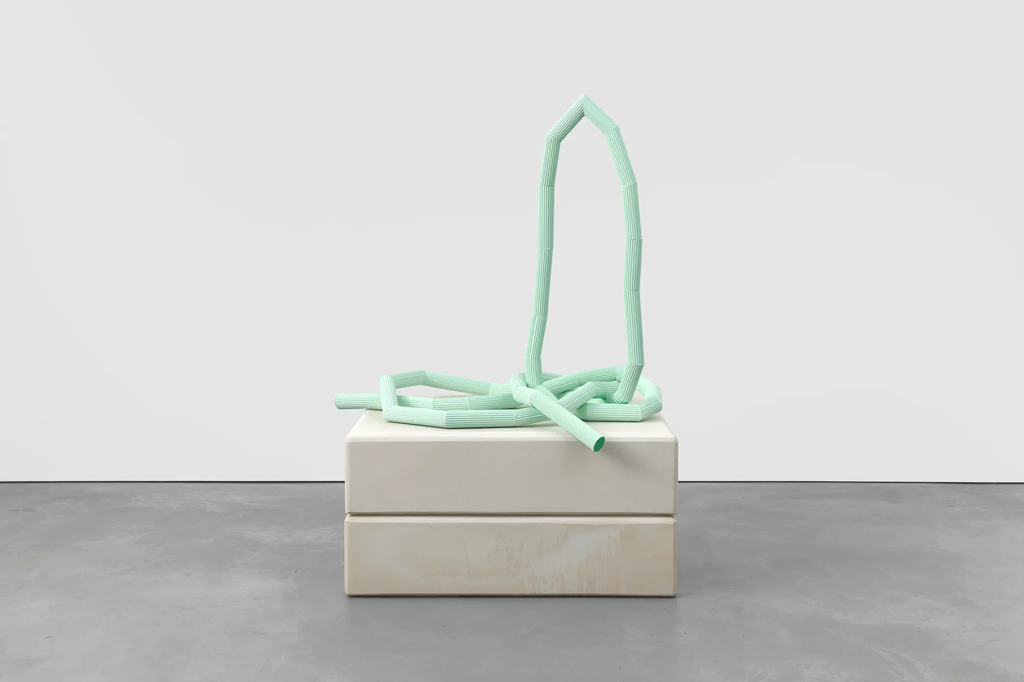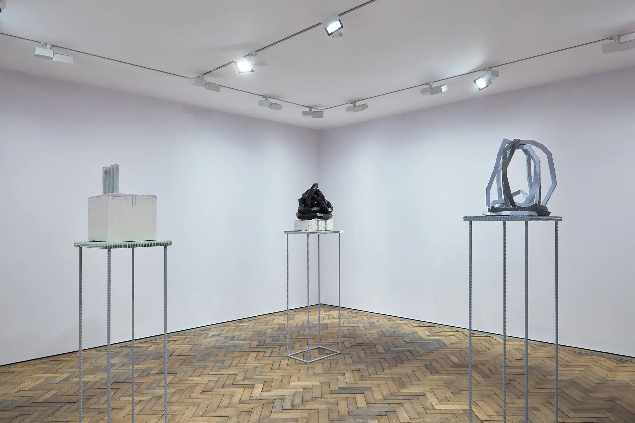 The title of Rothschild’s exhibition for Modern Art conveys the idea of solace, reflecting the pull of her focus inwards over the past two years, following her large-scale installation at the Venice Biennale in 2019. The central three new sculptures of Rothschild’s show, Sphinx, Madonna and Empath, respectively, are cast in Jesmonite, which belies their unexpectedly soft, pensive nature. Installed on Bury Street’s ground floor, they have been created with the domesticity of the space in mind, which they delineate with an indeterminate, shimmering quality, in contrast to her signature hard-edge black forms that sharply determine the space around them. Human-scale and painted in pale green, blue and pink, they carry a fresh vulnerability, inviting a closer, more direct encounter with the body than their predecessors might have. Consistent with Rothschild’s work more generally, her new sculptures are episodic forms, which is to say it is as though they could be broken down into smaller components or extended infinitely – a notion referenced by the Möbius shape of one of the works. Their heavy plaster bases are suggestive of a mold in use, supporting them as well as being a part of them, as though - made of the same matter - like mother and child, one was born of the other.
