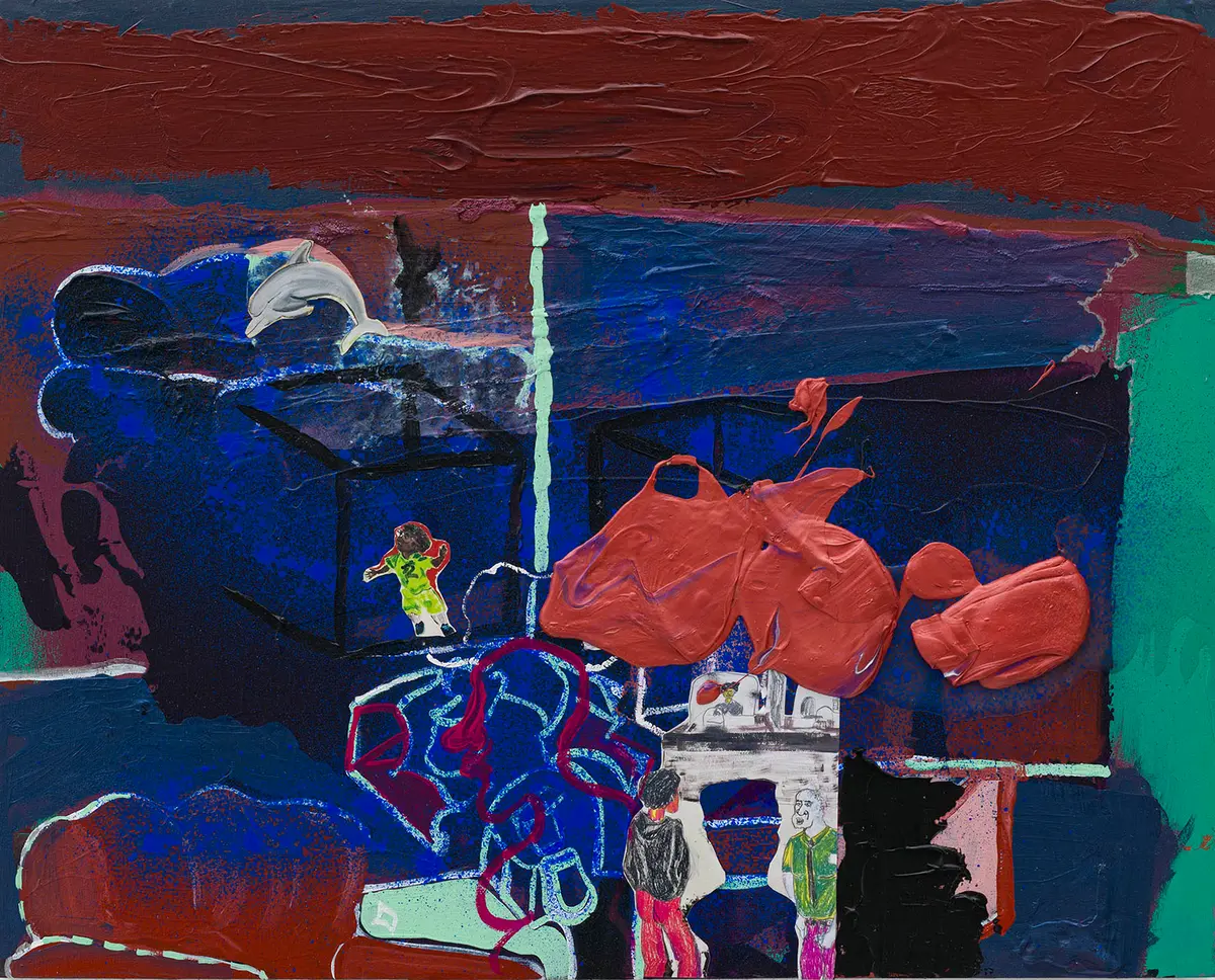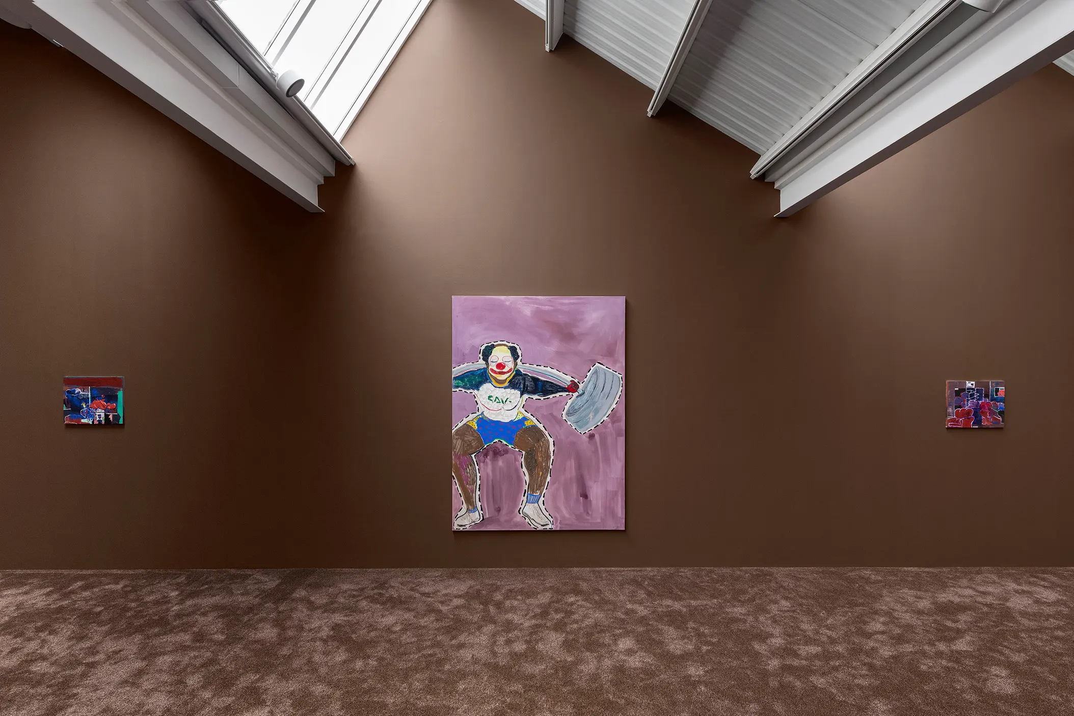 Price’s openness to materials, dissolves the boundaries between mediums—in this show he continues to foreground the importance of drawing to his paintings. His work is realised with multiple methods of mark making, including; graphic lines of ink, broad strokes of colour, and impasto stamps of paint. Recurring forms include: people, cartoon characters, armchairs, televisions, palm trees, cars, couches, the sun and brick walls. In a series of new works, domestic spaces act as metaphors for psychological interiors. For a series of works on board, bodies and heads often seen in groups are drawn with ink. Past drawings are wrapped with strips of brown gaffer tape to form new paintings, others he uses as a ground for new paintings with acrylic and gesso. ‘The Rebuild’, a new sculpture gestures to an exchange that brought about its making.