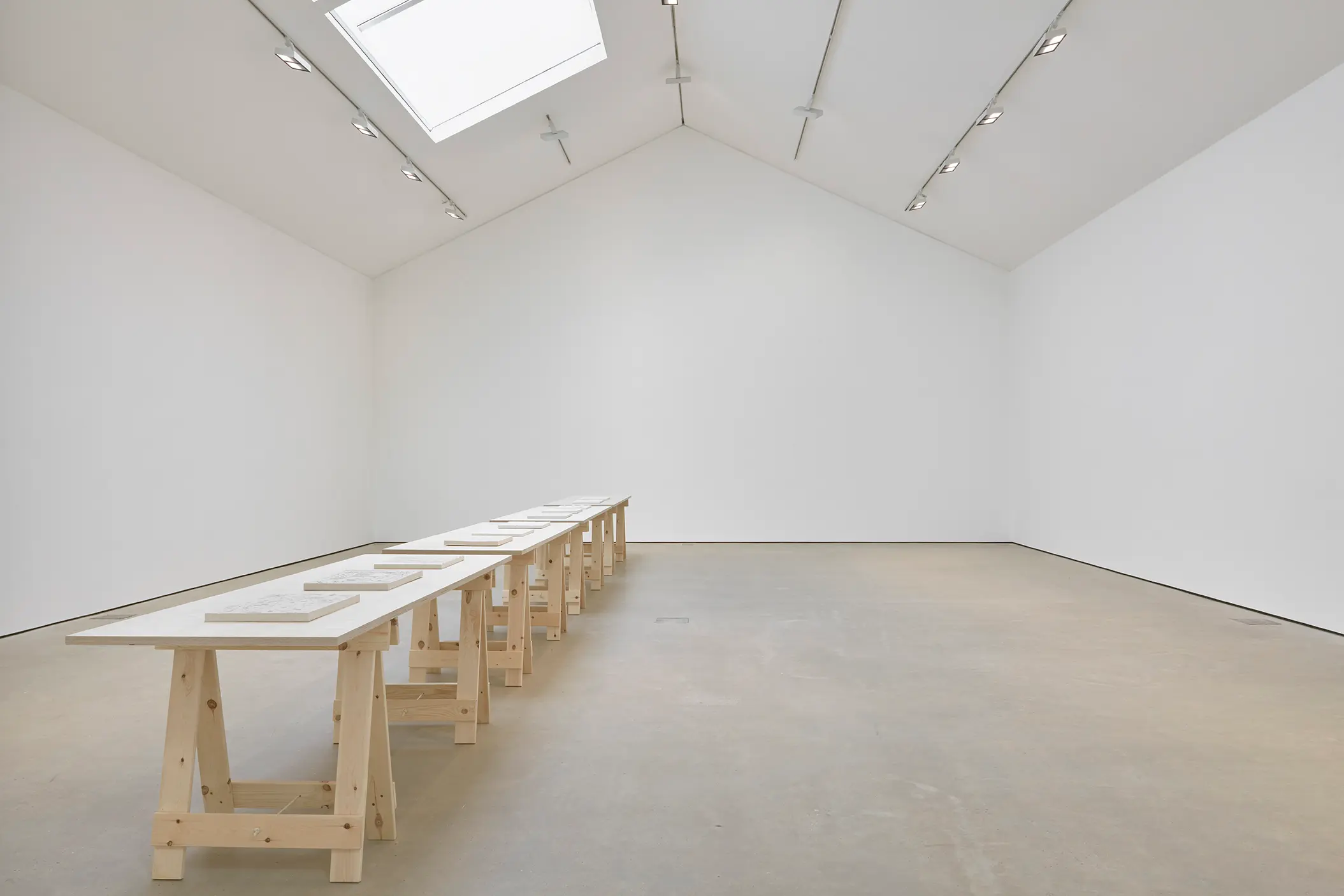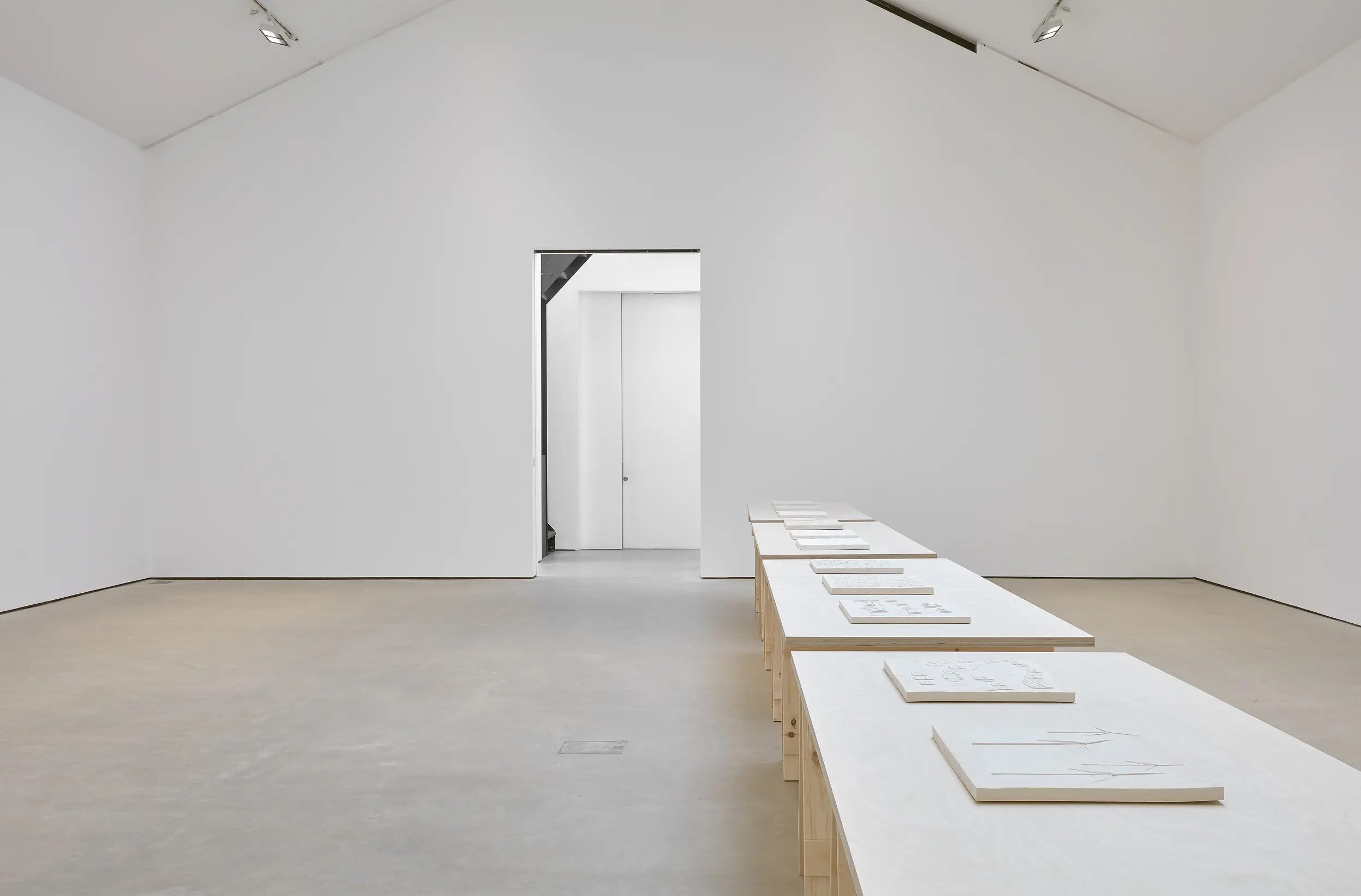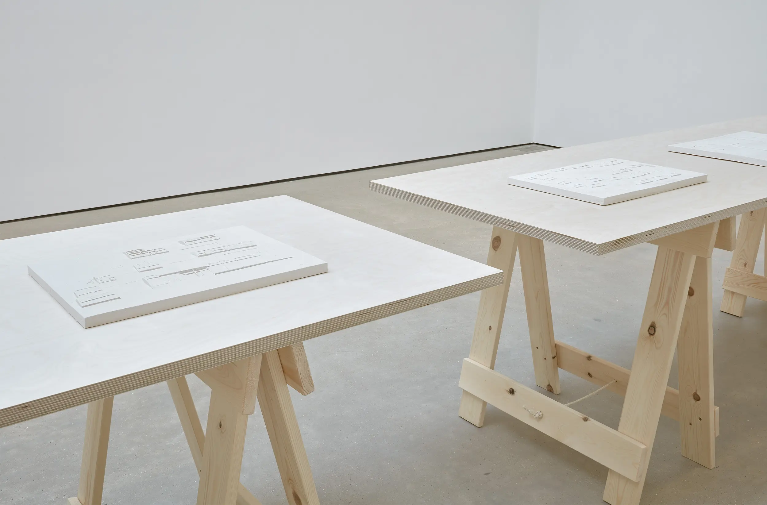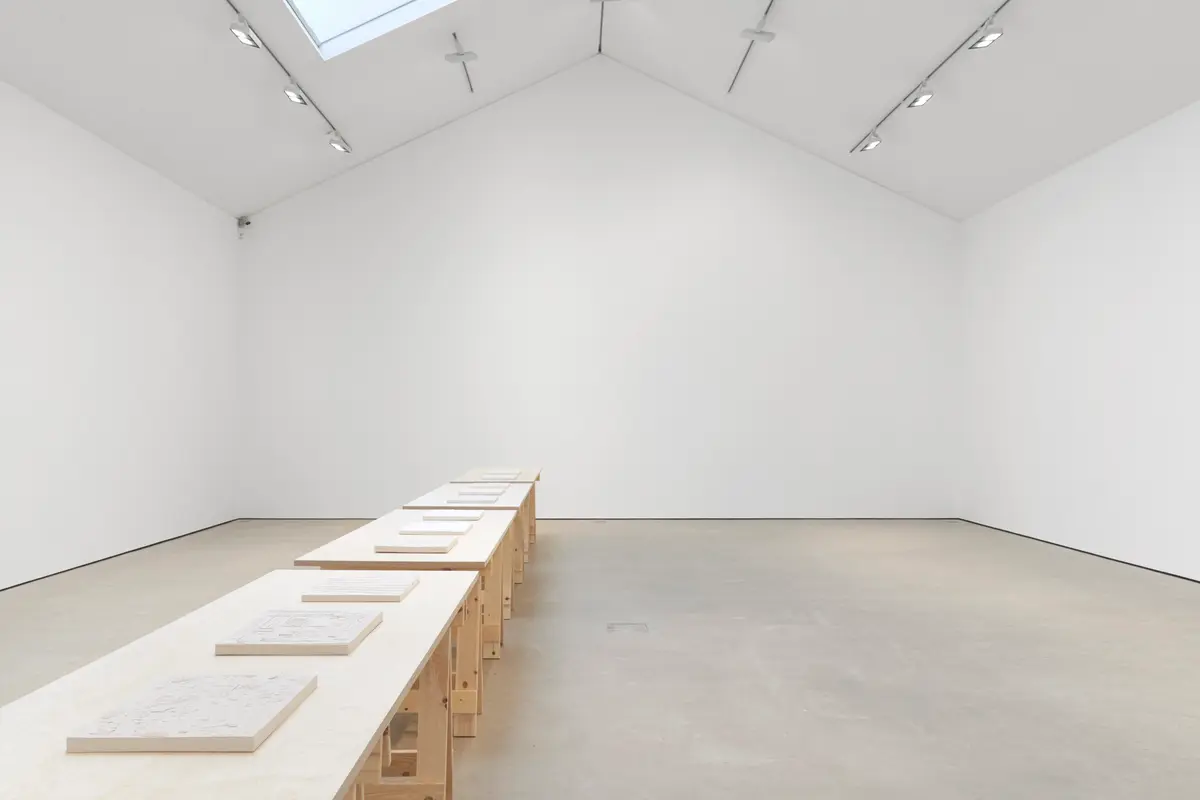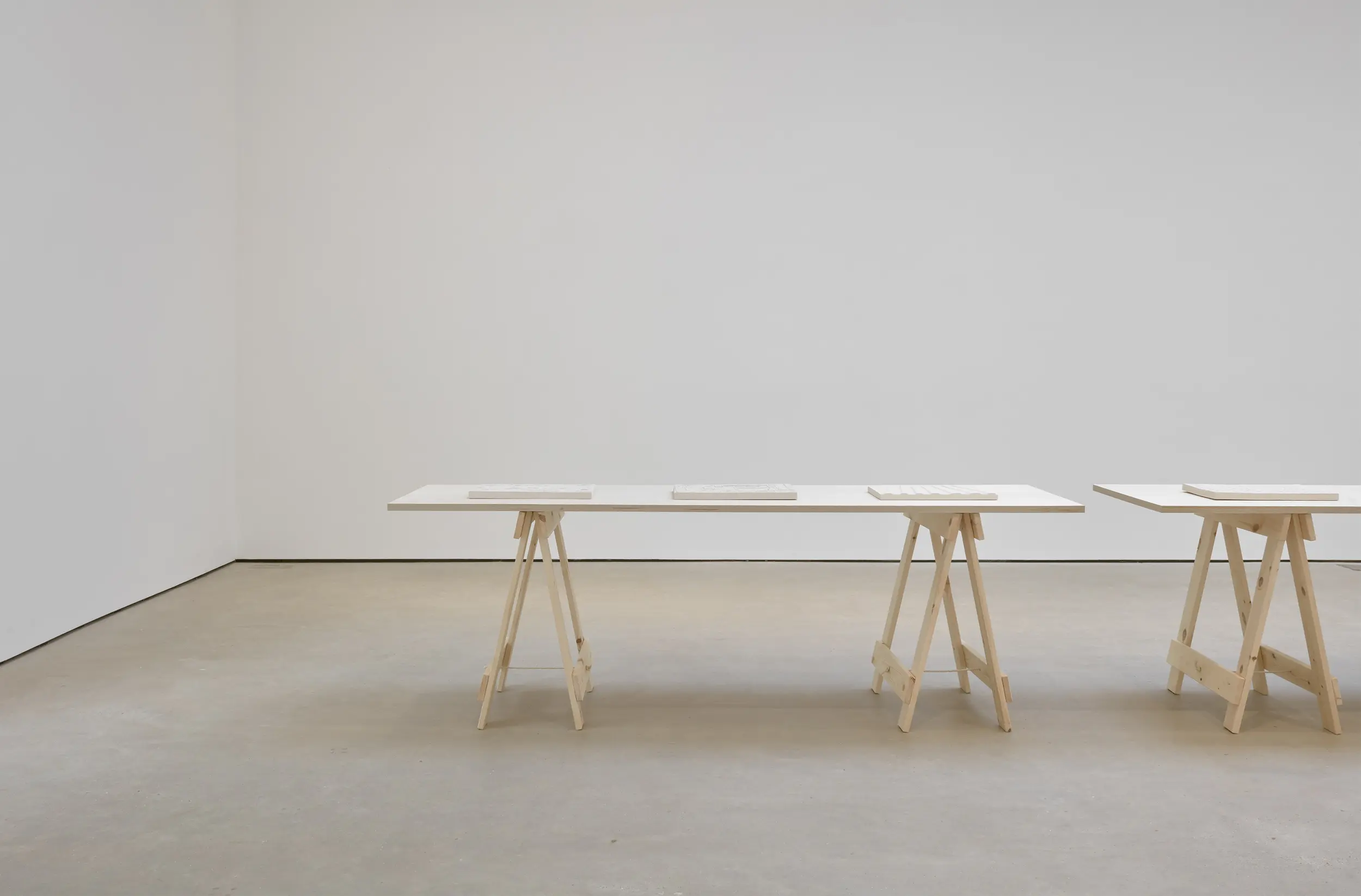 Anna-Bella Papp’s exhibition at Modern Art features a series of new individual sculptures that, consistent with her characteristic format, are hand-sculpted, tablet-like forms made from fired clay, presented on long trestle tables in one narrative. Papp’s works move between representation and abstraction, each series exploring a different set of ideas through various techniques of sculpting and mark-making, all the while seemingly aware of and contained within the regular confines of their objecthood.