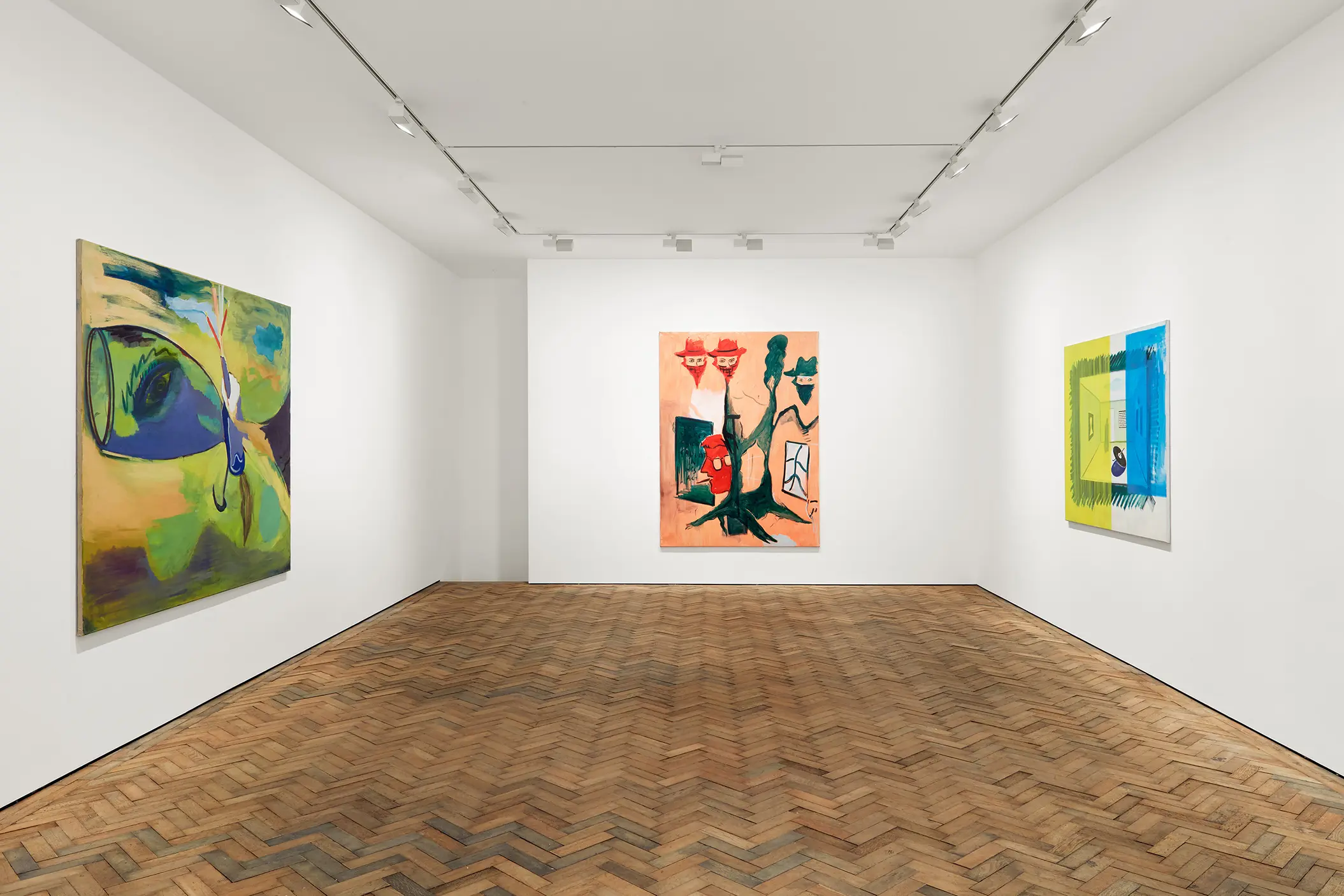 Modern Art is able to show a group of paintings that were made between 1980 and 1987, during Daniëls’ most pivotal period of development. The works encompass a range of Daniëls’ configurations, including some of his most iconic forms and motifs. Perhaps his most famous is what has come to be known as the ‘bowtie’ paintings, in which the perspective of a floating, abstracted, three-walled space – resembling that of a gallery – is amplified to crudely resemble the shape of a bowtie. Allegory and ambiguity are constitutional elements of Daniëls’ works, but self-referential witticism and semiotic play is only one register among several present. Bright and harsh colour palettes, spontaneous painterly mark-making, and boldly sketched, cartoonish characters come together to produce atmospheres so elusive and yet so specific, their logic could be said to be matched only by dreams or hallucinations.