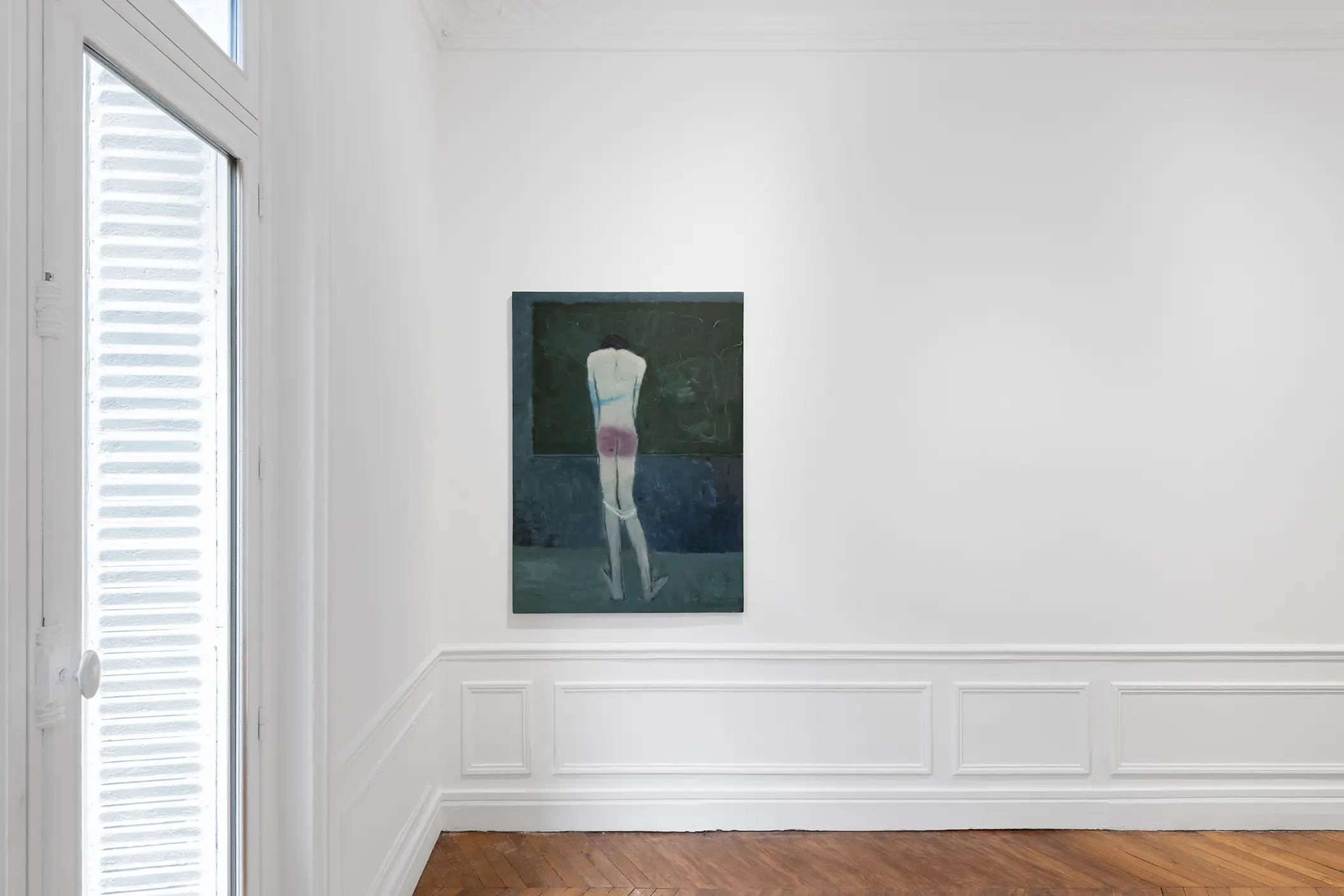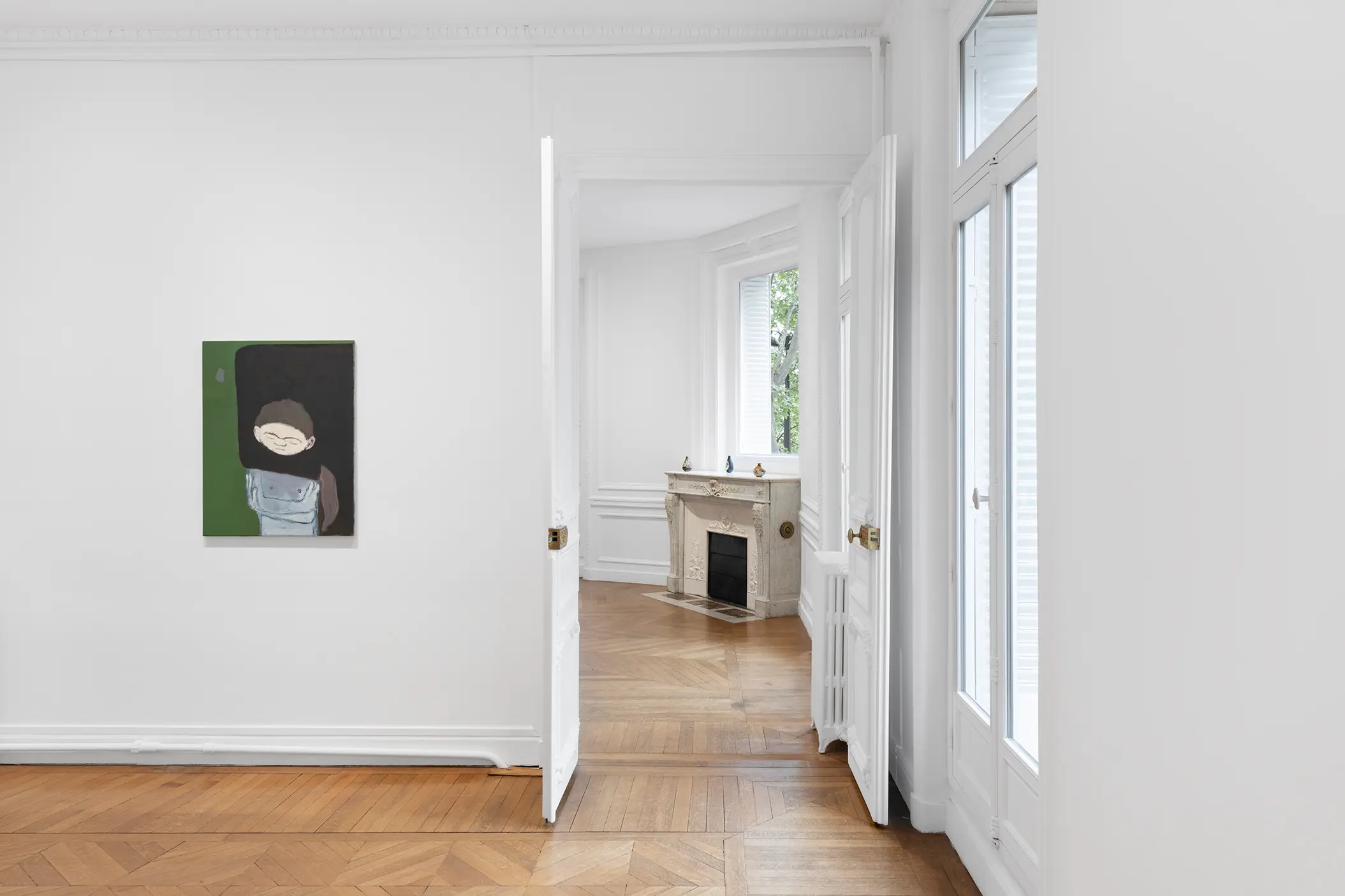 Unlike Daumier’s young rascals, the children here seem resigned to punishment, with the initial act of transgression hidden from view. This omission does not seem to matter much; the focus remains on the child’s consequential state of detachment. Quiet and submissive, the solemnity of the young figures could make one wonder: what is being taught here? Children are rendered in vague, unhardened features, as if to emphasize their youthfulness and vulnerable malleability. The adult figures of authority are at times entirely obscured, with faces that are marbled by swirling, evaporated paint or scumbled out of focus. Their features are marked by receding hairlines and a stiffness of form—a hand that never leaves its pant pocket, shoulder pads fitting just right. One figure casts a heavy shadow across an otherwise flat scene, suggesting the singularity of his stature. Depending on who is asked, these men may be custodians or they may be tyrants.