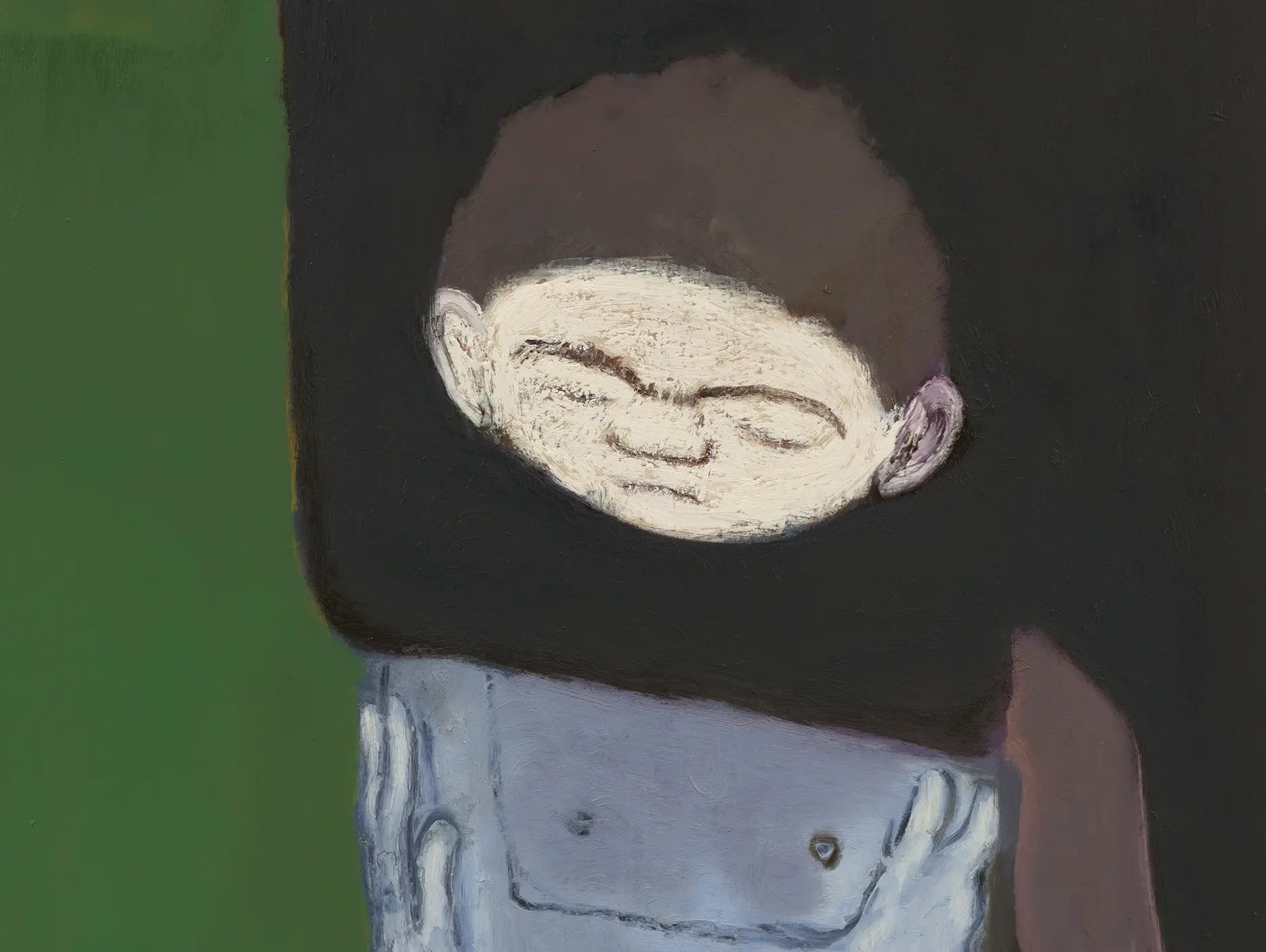 Is there space in this imbalance for a life lesson? While our teachers and guardians may hold precious knowledge, there is a certain irony witnessed in the stupidity of authoritarianism. In another scene, a young boy’s shoulder acts as a resting surface for a towering forearm and limp wrist, which encases the child’s head against their monolithic torso. An even more quiet form of hostage takes place in a scene painted from memory of Kantarovsky’s Soviet school portrait: a freckled boy, suited, combed and buttoned, his stoic hand raised to formally request permission to speak. It is entirely uncoincidental that this face of good graces is also the one that most closely mimics the composure of an adult scholar. It could be the picture of a lifelong learner, or a childhood robbery.