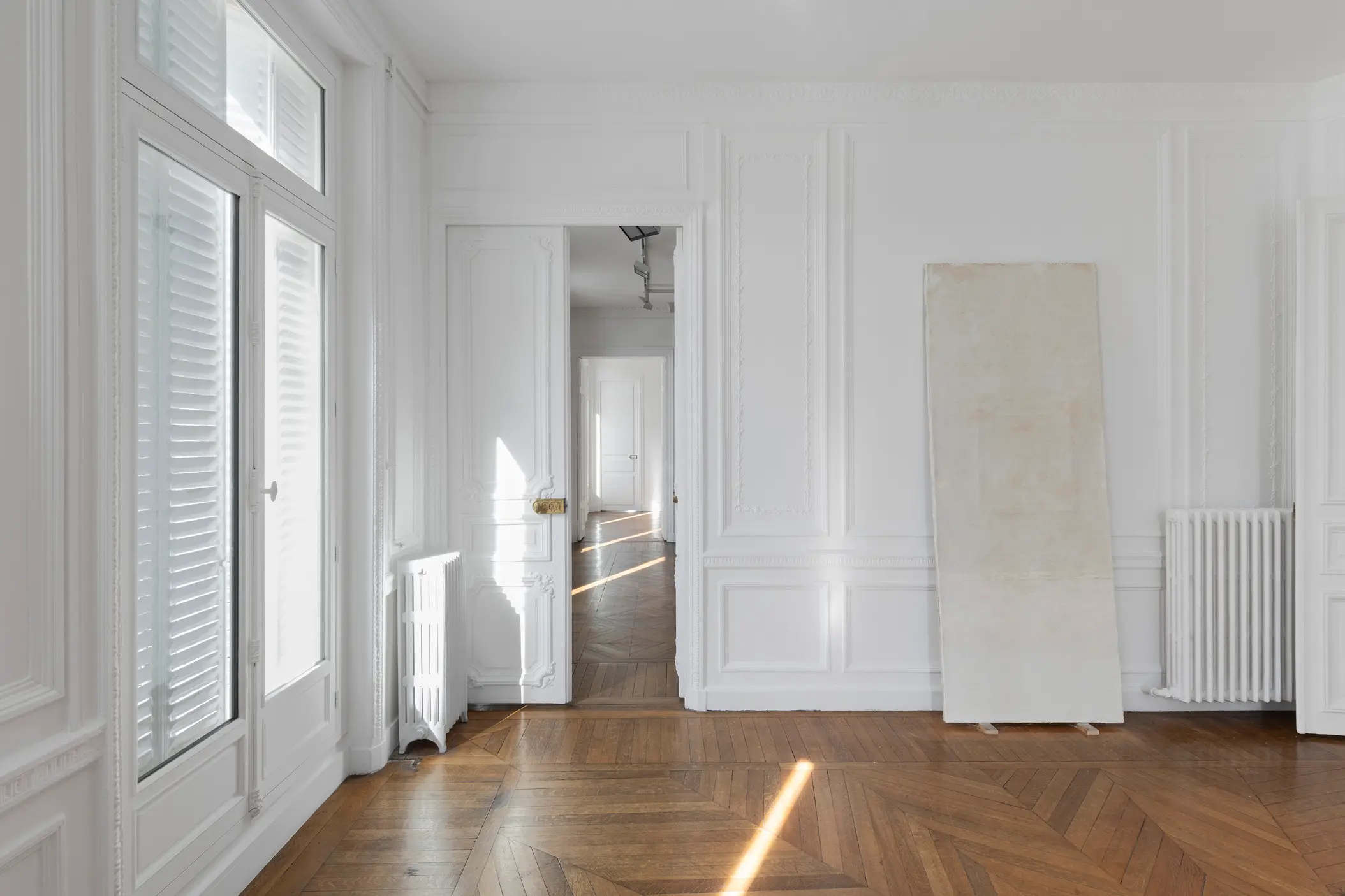 In a world in which one can call up and access images with ease, Rapson wrestles with the space of documentation itself as an endless displacement and overlaying of exhibition history, applying black-and-white installation photography taken from art magazines to the walls and windows. In Monet, for example, a photograph of Claude Monet’s Water Lilies at Musée de l’Orangerie, Paris, is attached to the gallery window, and a smudge of masking tape on the wall holds an image of an ornate writing desk in sans titre. These inclusions further capture the space between the abstract and the photographic, the speculative and the indexical – one edging into the space of the other as if joined in some libidinal art cult circuit.