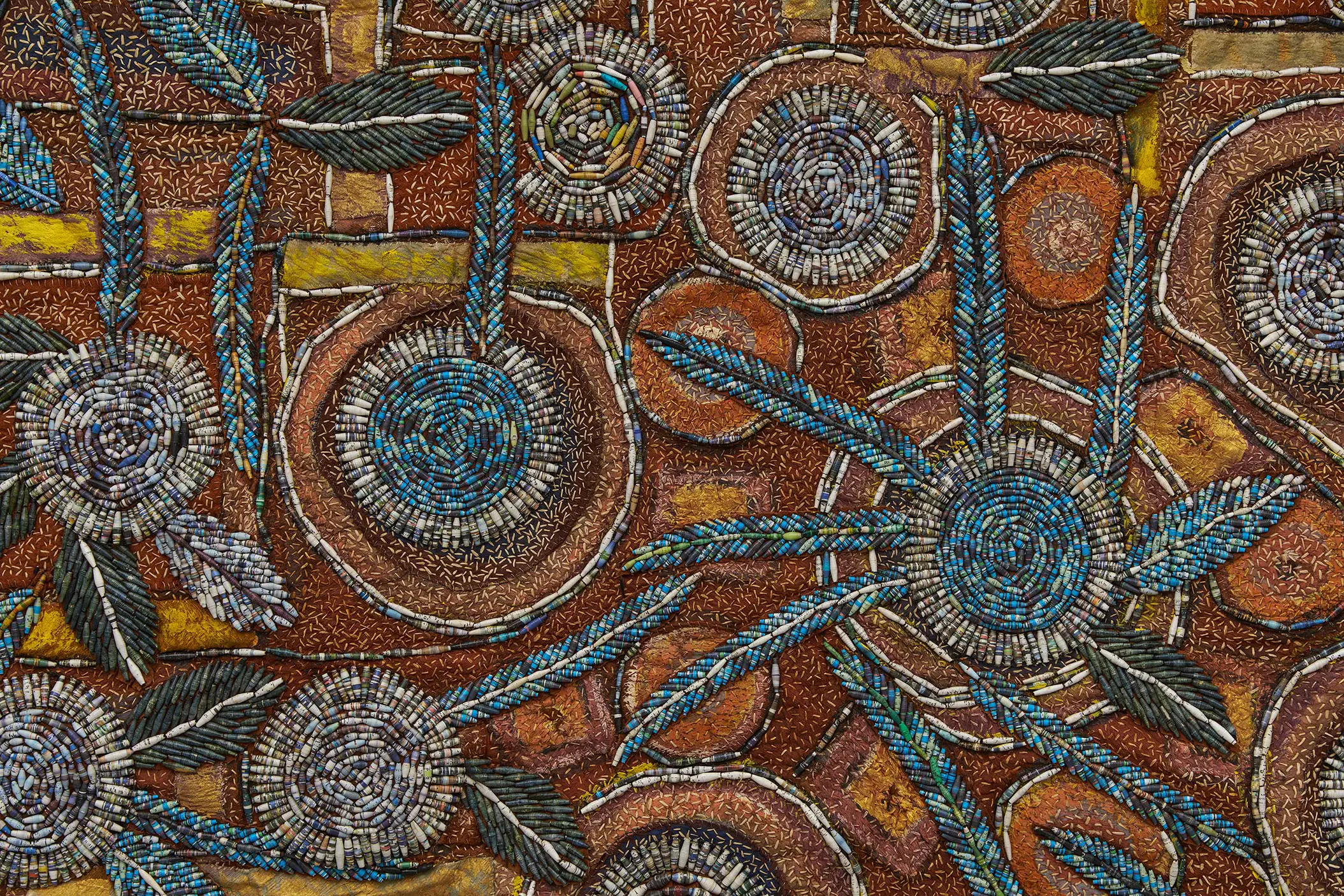 Over 10,000 miles across the globe, in the central desert region of Australia’s Northern Territories, one imagines Ngoia Pollard Napaltjarri would have instinctively understood Colquhoun’s sense of cosmic consciousness and connection to the land. Napaltjarri (1948-2022), a Walpiri-speaking indigenous woman, painted her ‘dreamings’, or stories, that related to her father’s sacred country around Yamunturrngu (Mount Liebig) and near to where she lived. The oval shapes in her paintings, representative of the lakes that appeared after rain, were charged with the spiritual presence of the water snake that lies beneath the surface.